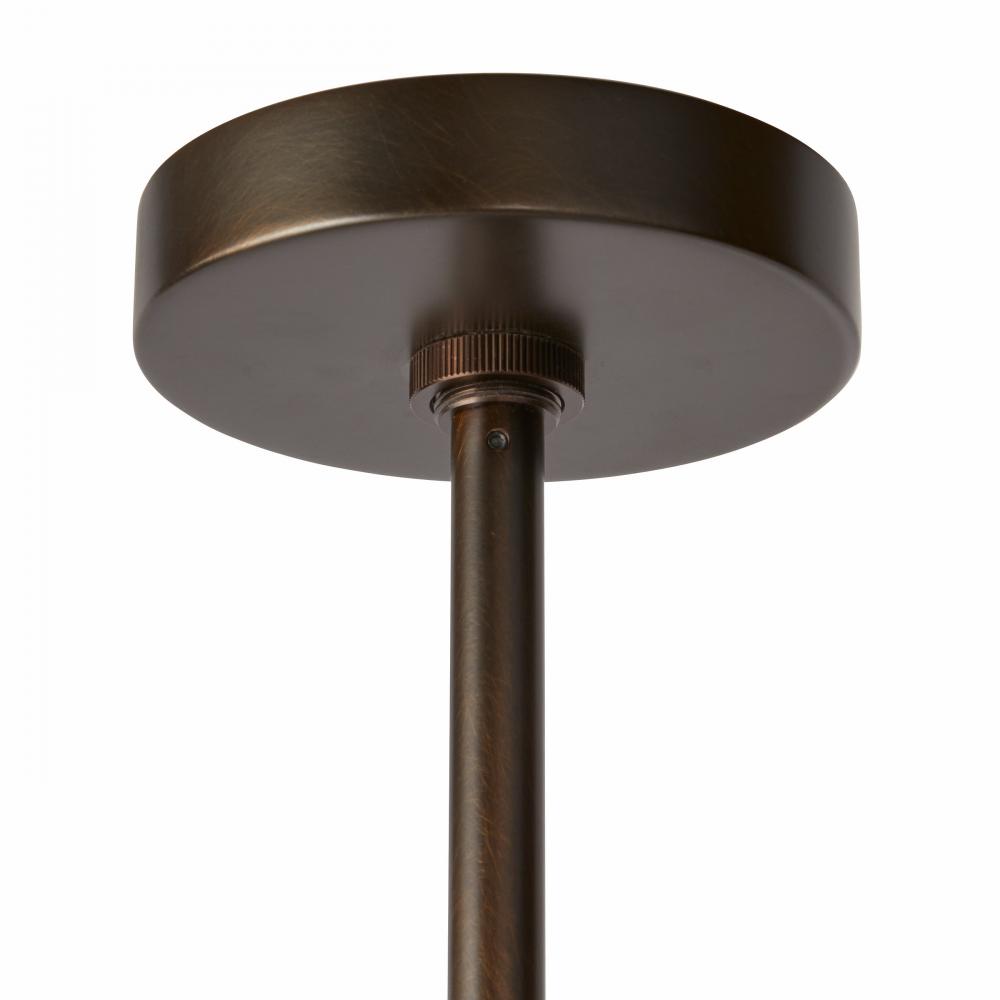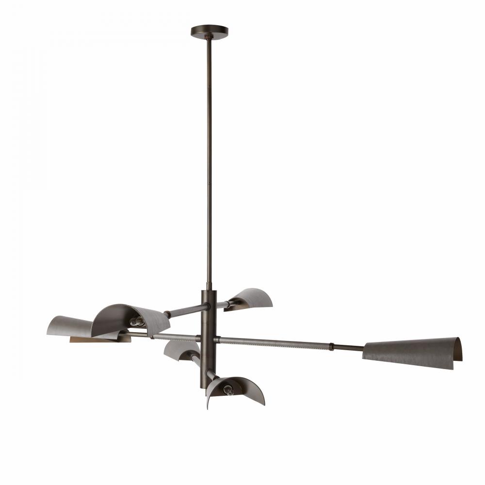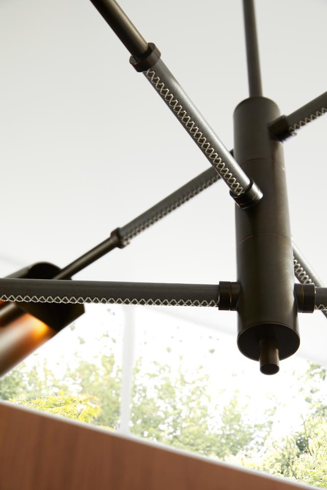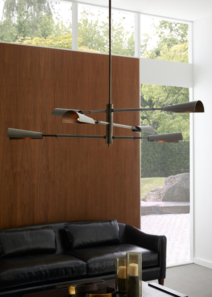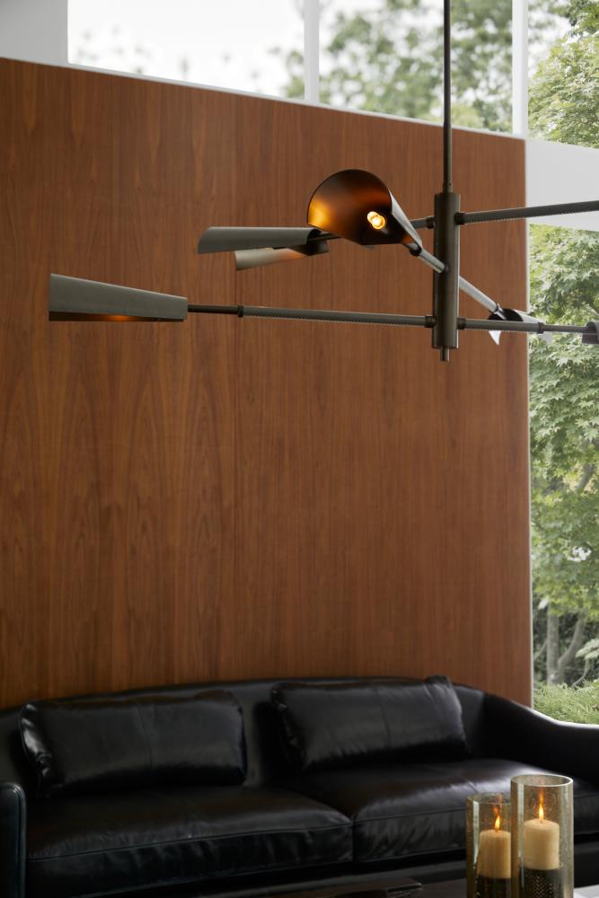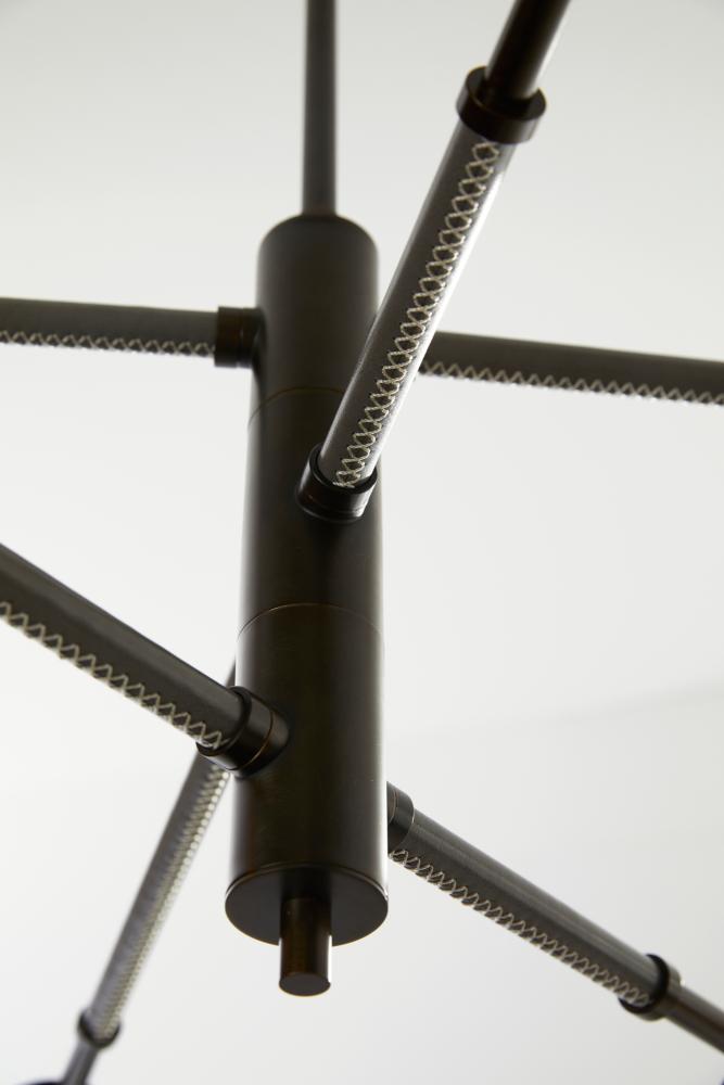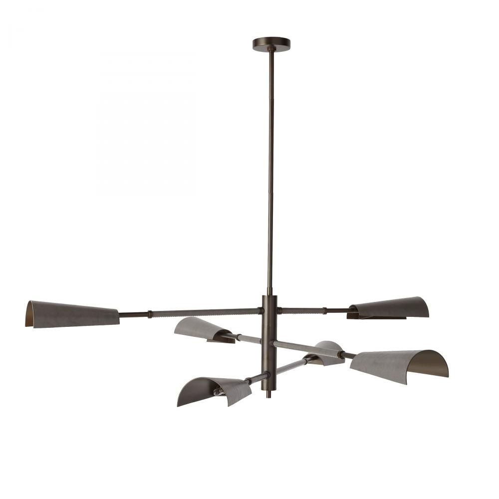 Both masculine and modern, the English bronze-plated steel Estevan adds hint of industrial Americana to any setting. We suspended sextet of graphite leather-wrapped shades from a slim english bronze arm to allow adjustable, multi-directional illumination. Finish will vary.