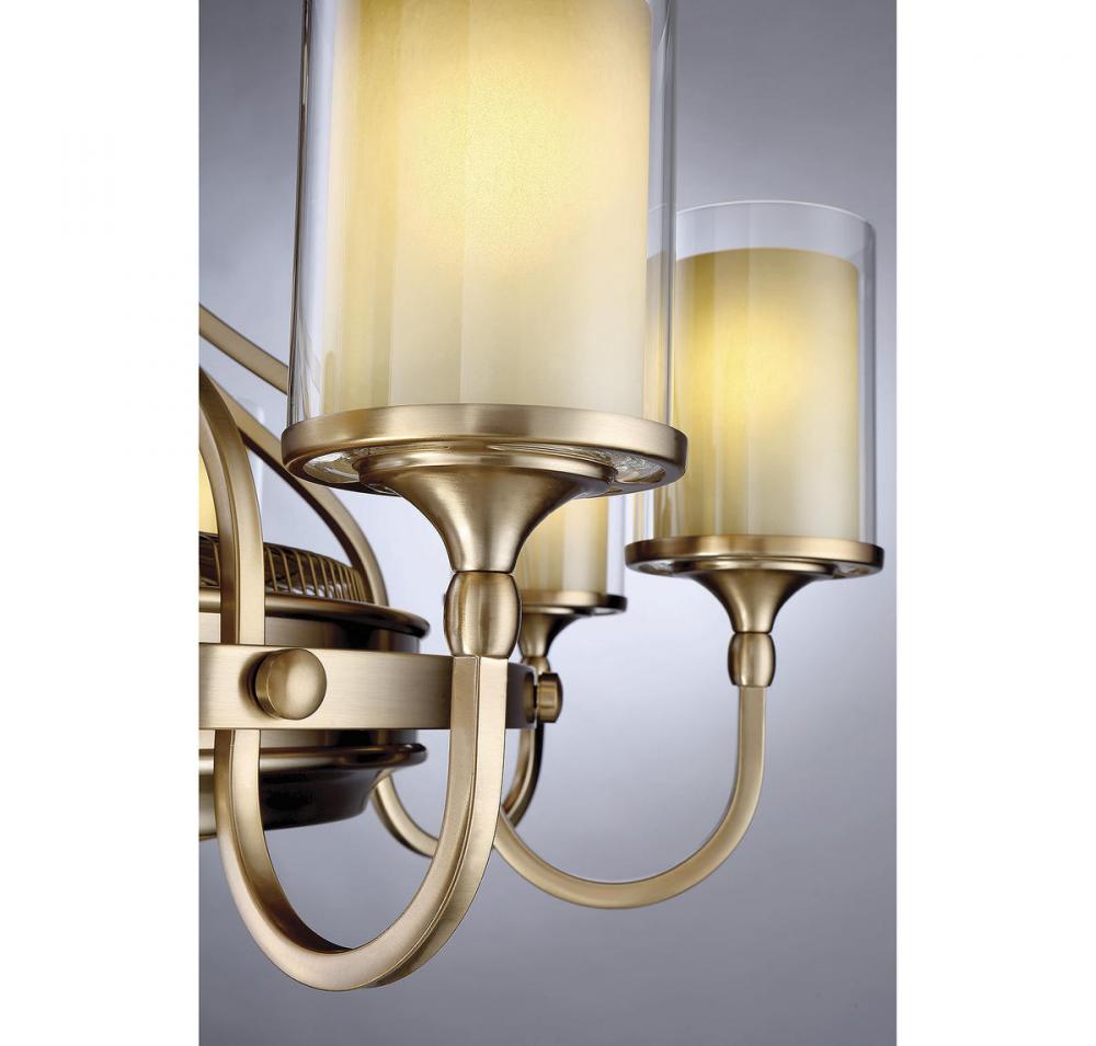 When you’d like both a stylish chandelier and the cooling comfort of a ceiling fan, choose this Etesian fan d’lier. It’s the perfect combination of practical function and beautiful design for your home. Six graceful, curved arms hold elegant streamlined candle cups, with nicely decorative details. The circular fan housing has a refined, two-tier design and delightful finial and canopy. And the entire structure has a gorgeous burnished russet finish. The six shades are beautiful, too: each has an outer cylinder of clear glass and an inner cylinder of cream-colored glass —allowing glare-free illumination from the included 6W, dimmable LED bulbs. A full function handheld remote is also included, so you have independent control of the light and fan.