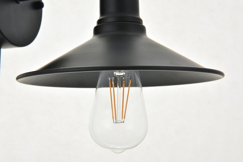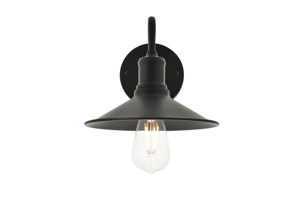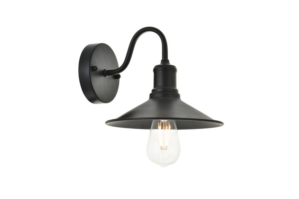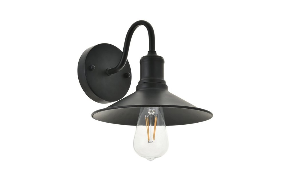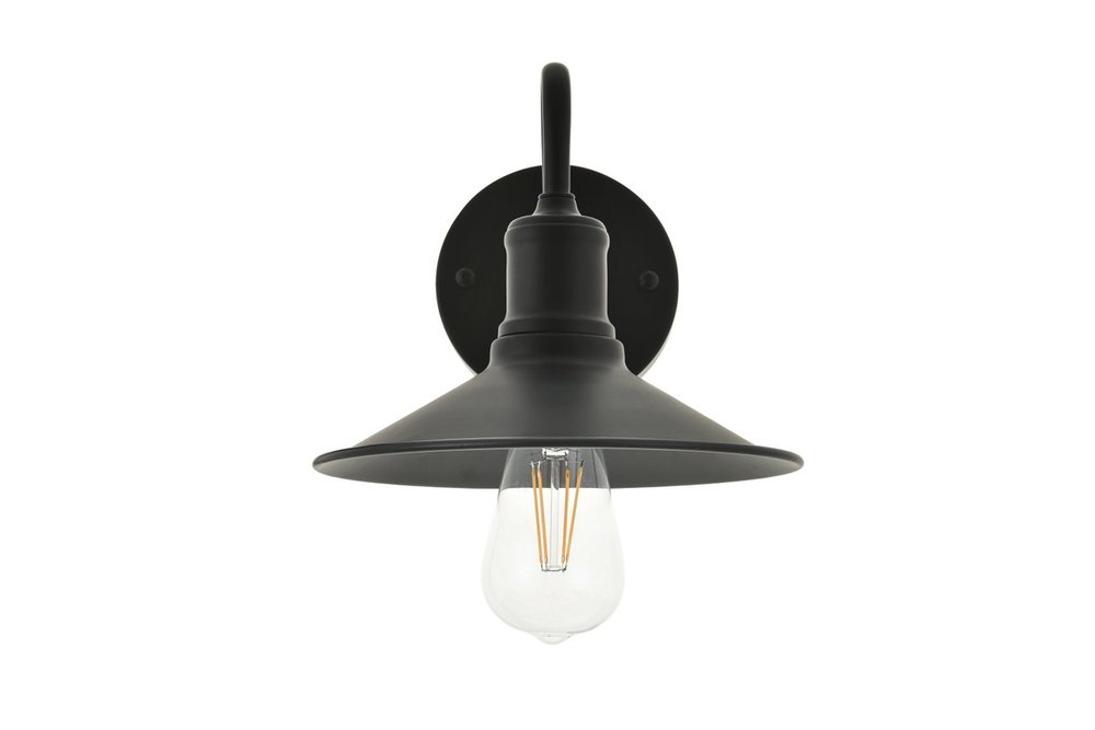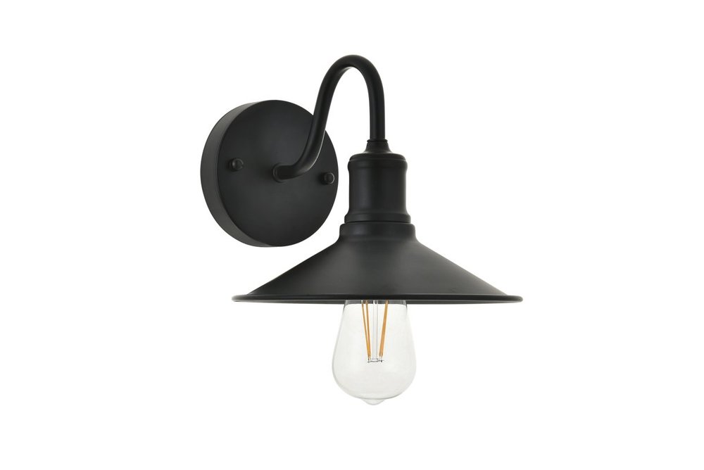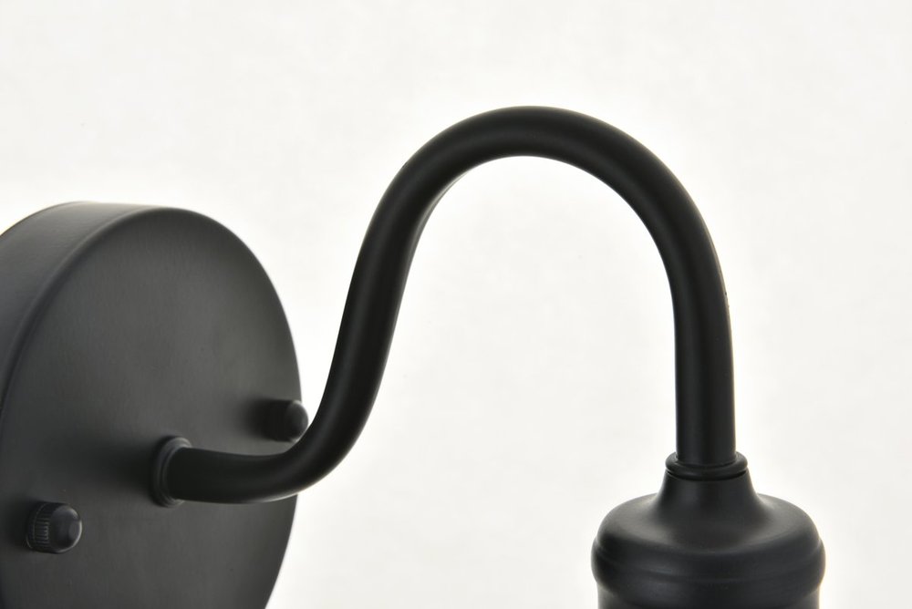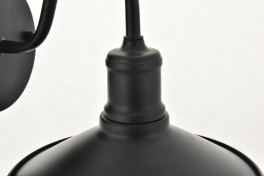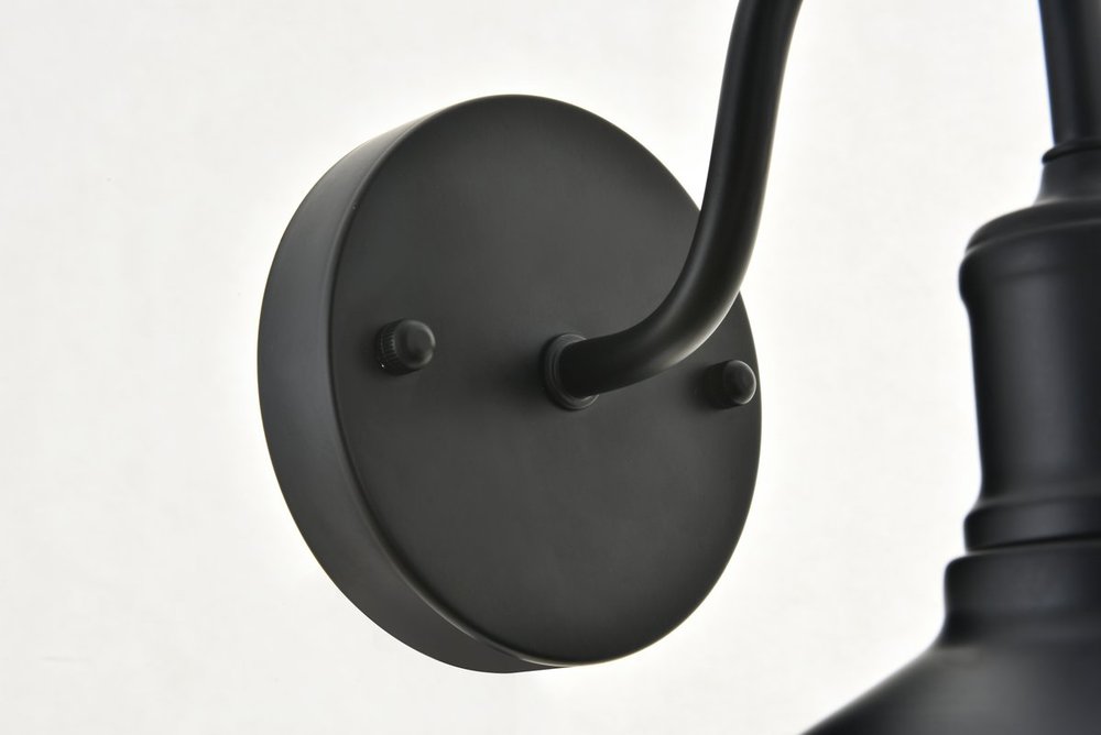 Black finish wall sconce with a curved arm and cone shaped shade