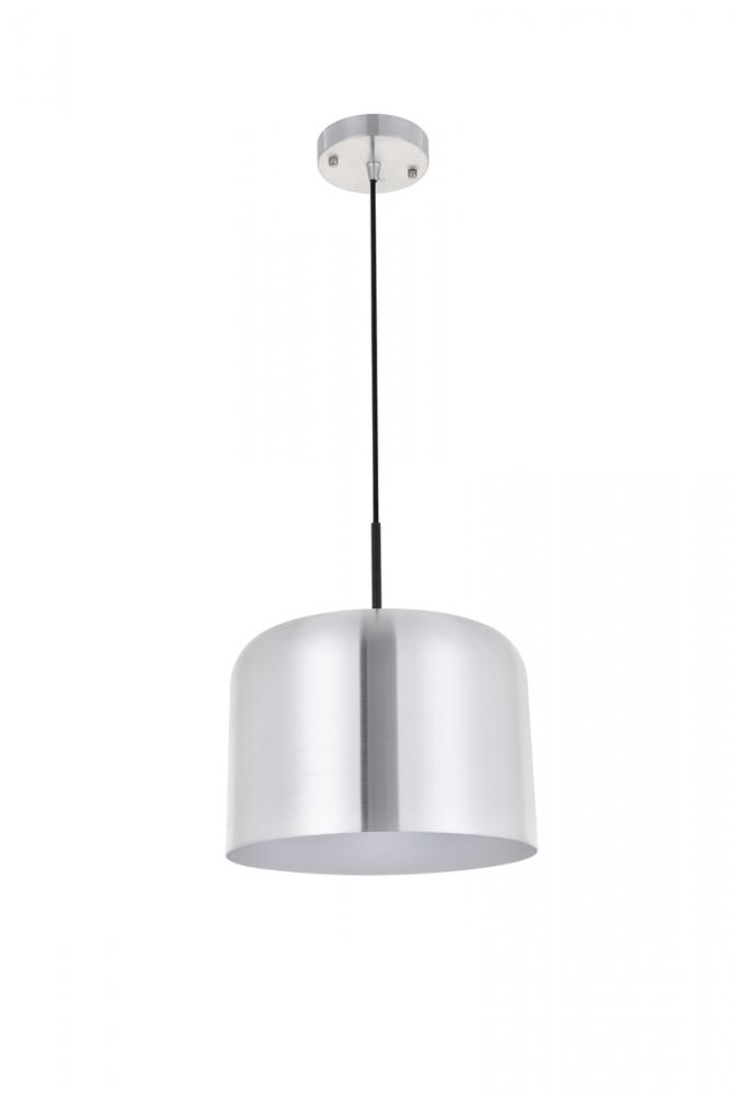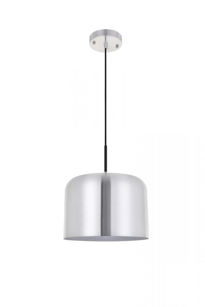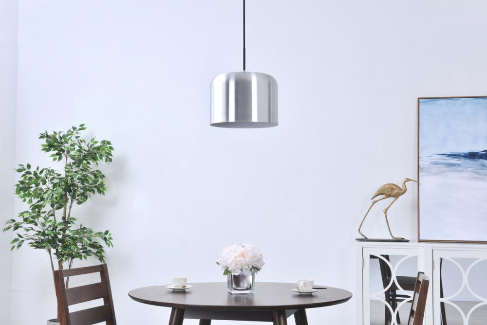 Contemporary brushed nickel finish pendant lamp with a cylinder shaped shade