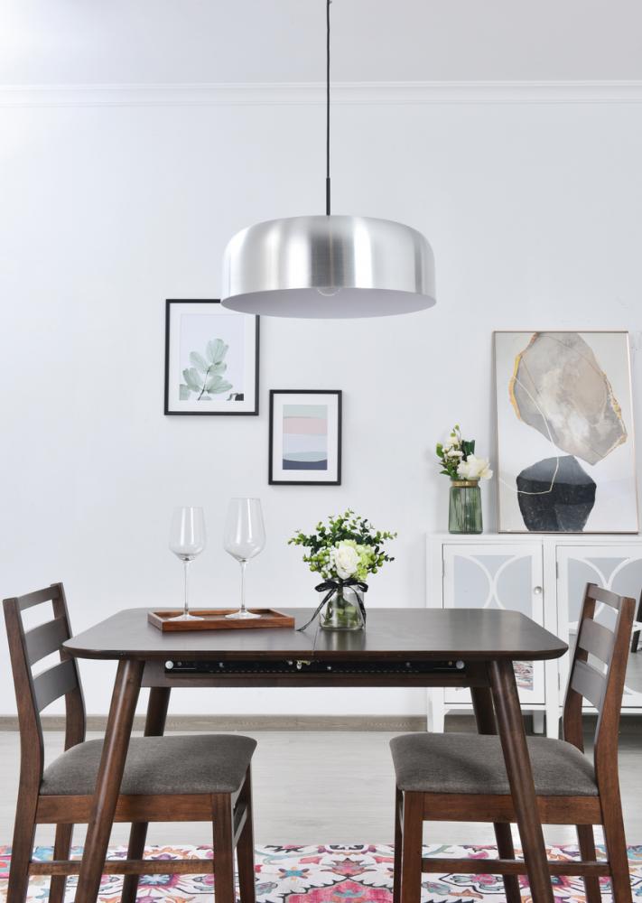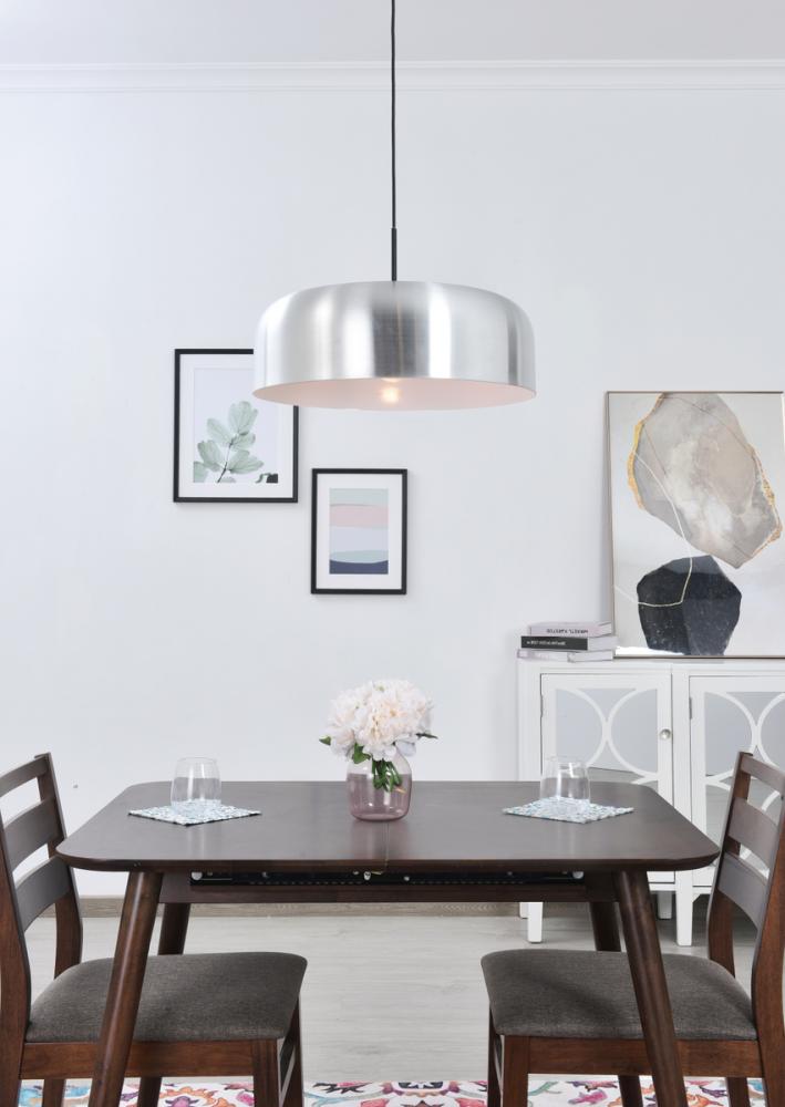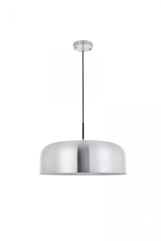 Contemporary brushed nickel finish pendant lamp with a cylinder shaped shade