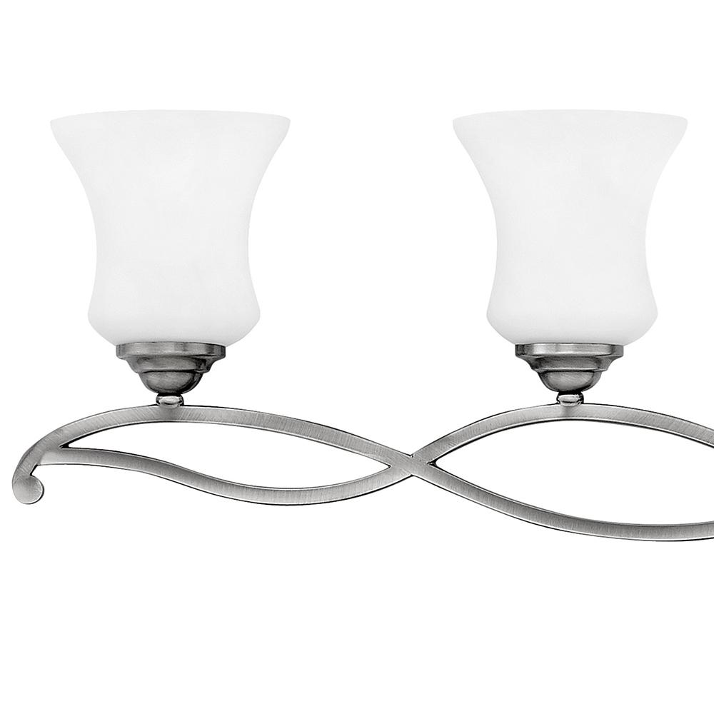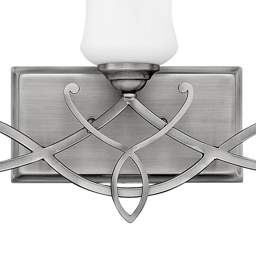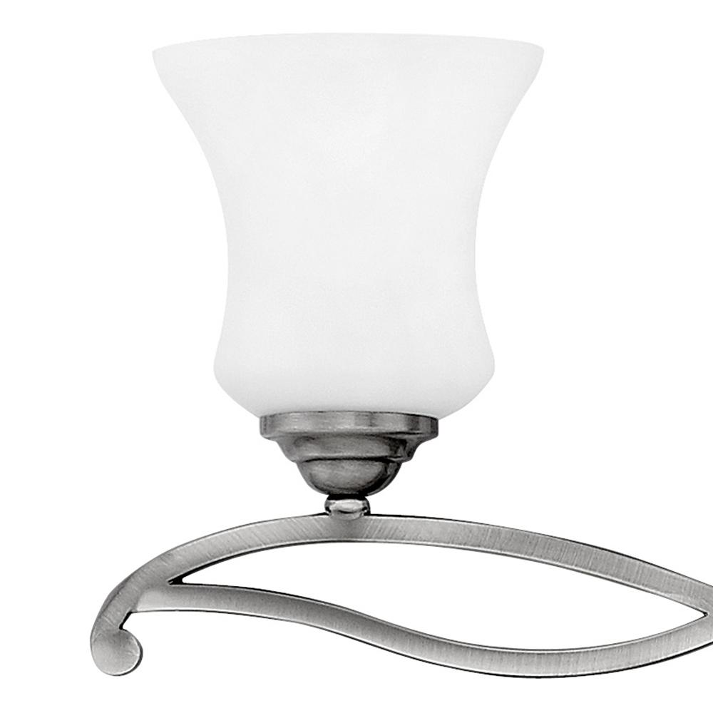 Brooke's updated traditional look features a minimalist forged scroll design in Antique Nickel and Olde Bronze that elegantly complements its etched opal glass.