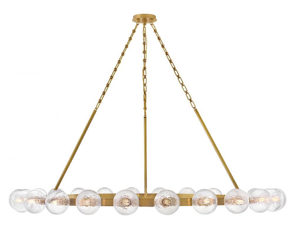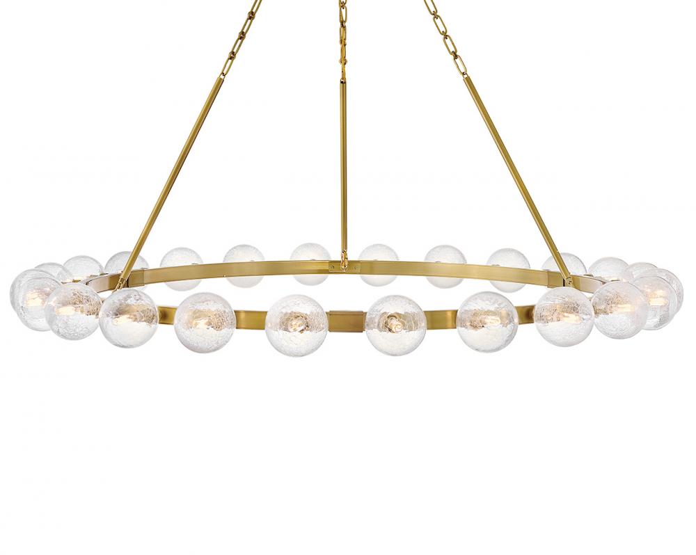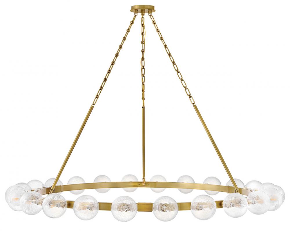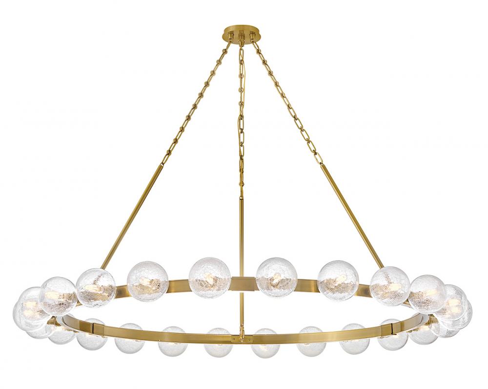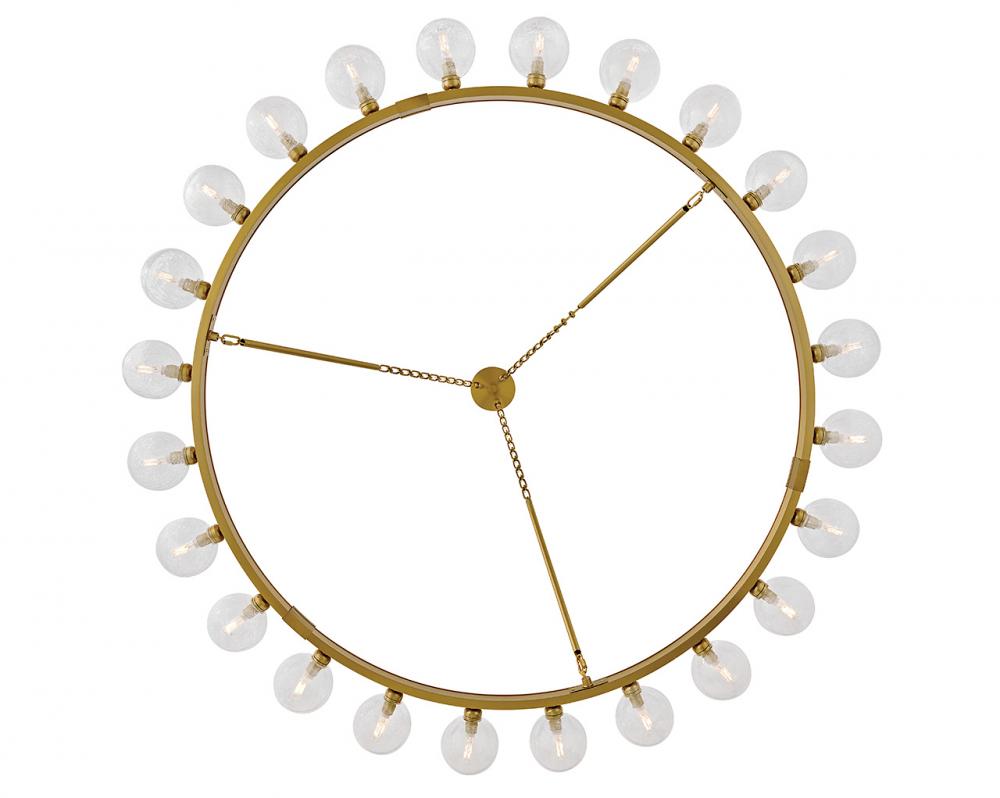 Dramatic crackled glass globes surround Coco’s timeless silhouette with unexpected, distressed detailing. Minimal framing suspended from decorative stem-to-chain uprights features a warm and inviting Lacquered Brass finish.