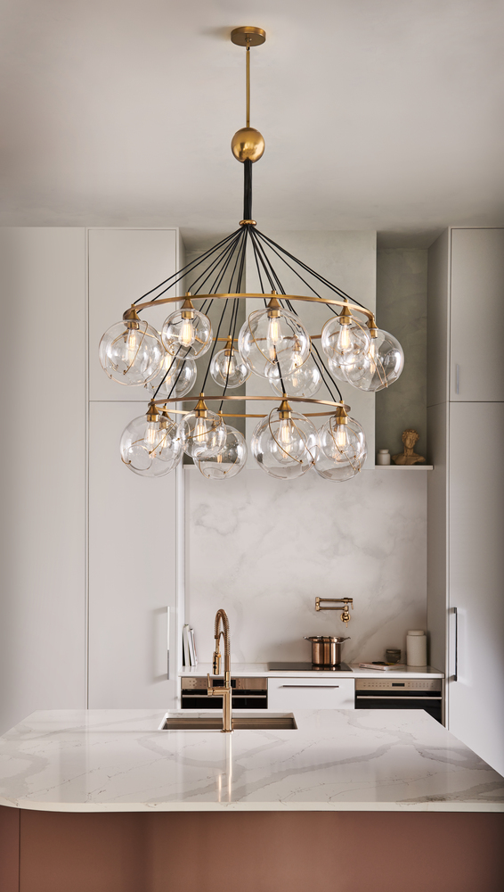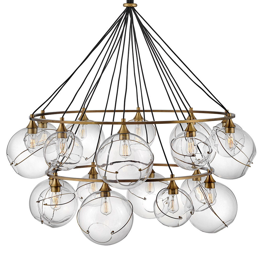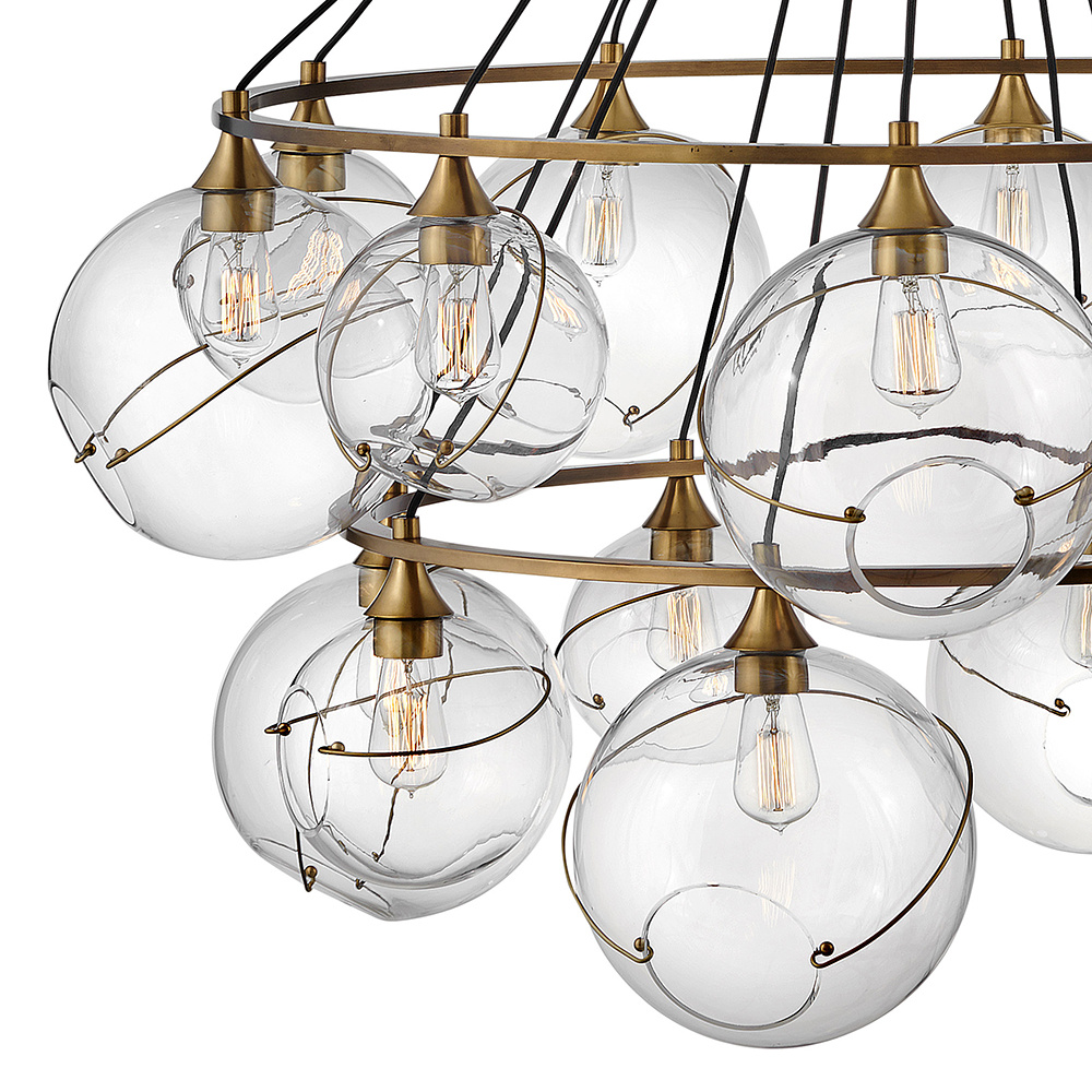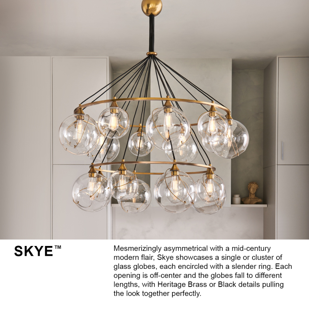 Mesmerizingly asymmetrical with a mid-century modern flair, Skye showcases a single or cluster of glass globes, each encircled with a slender ring. Each opening is off-center and the globes fall to different lengths, with Heritage Brass or Black details pulling the look together perfectly.