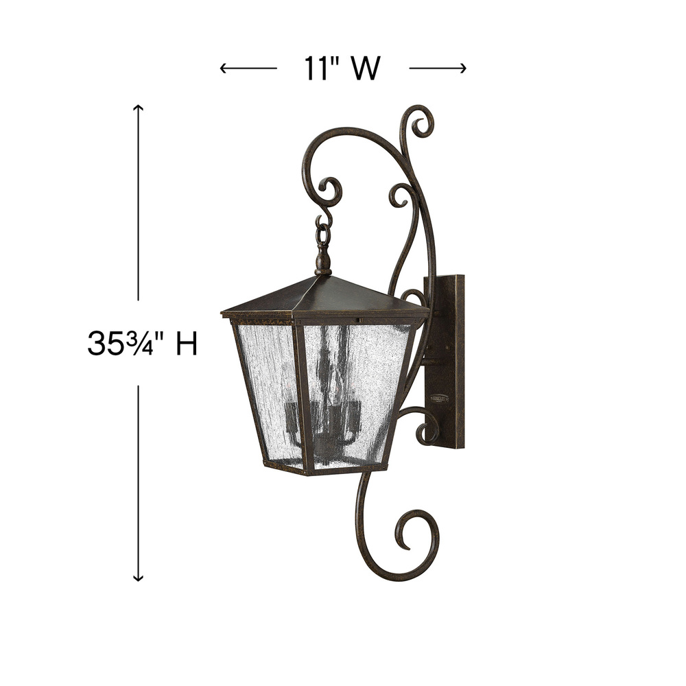 Trellis is a traditional European lantern design in an Aged Zinc finish with clear glass or Regency Bronze with clear seedy glass. The large scroll arm detail, cast loop finial and true rivet detail create a refined elegance.