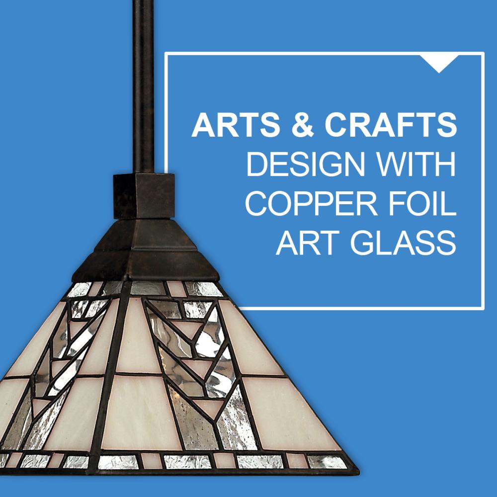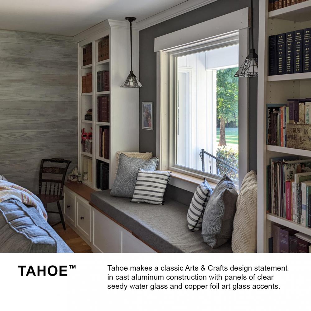 Tahoe makes a classic Arts & Crafts design statement with panels of clear seedy water glass and copper foil art glass accents.