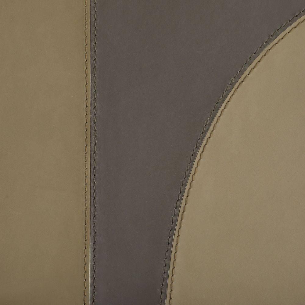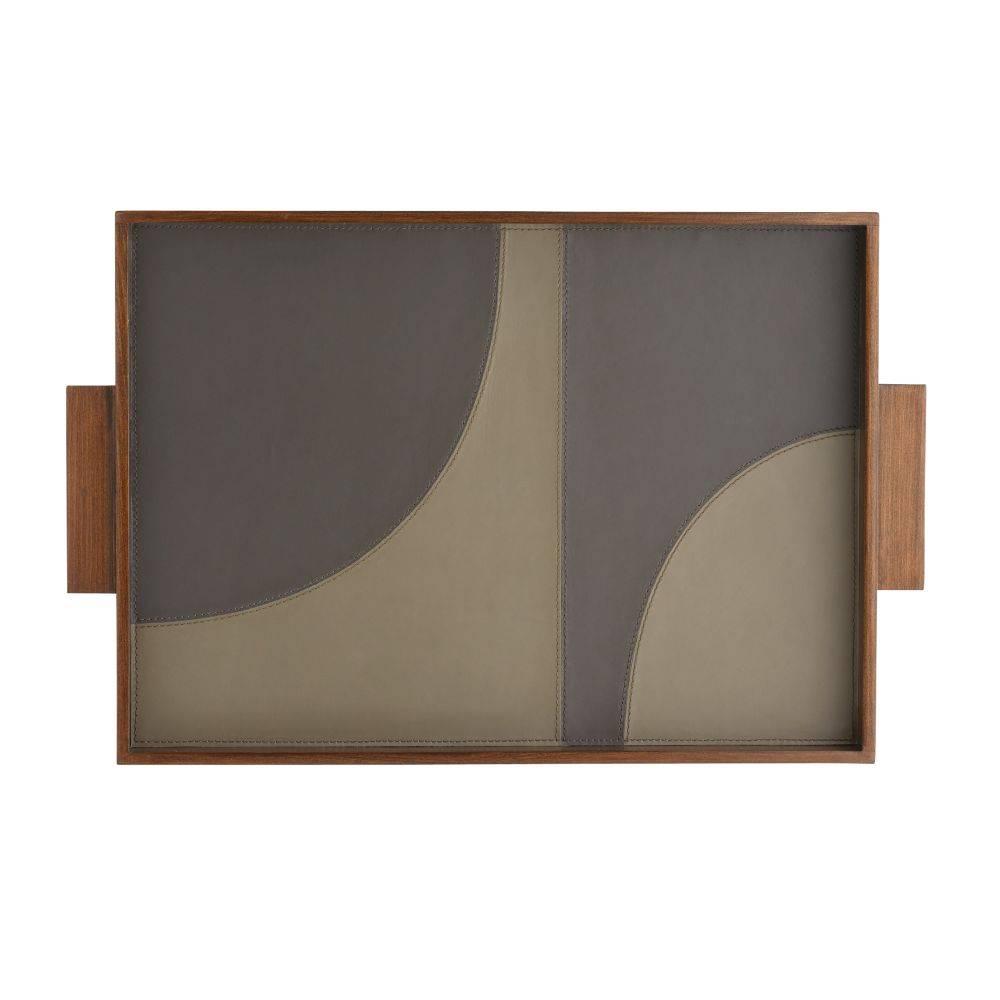 Mixing graphite and morel leather and walnut wood, a play of graphic positive and negative shapes forms an elegant surface. Expert finger joinery at each corner embraces traditional wood crafting techniques. Subtle curves on the underside of each handle allow for easy handling. Finish will vary.
