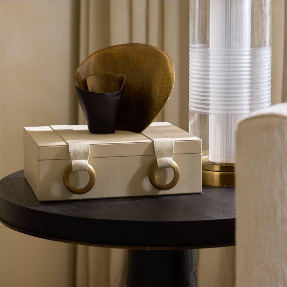 This equestrian keepsake box possesses a tailored balance of masculine and feminine styles. Made of ivory leather with a sumptuous suede interior, it features a hinged lid and is accented with double harness straps finished with antique brass pulls. Finish will vary.