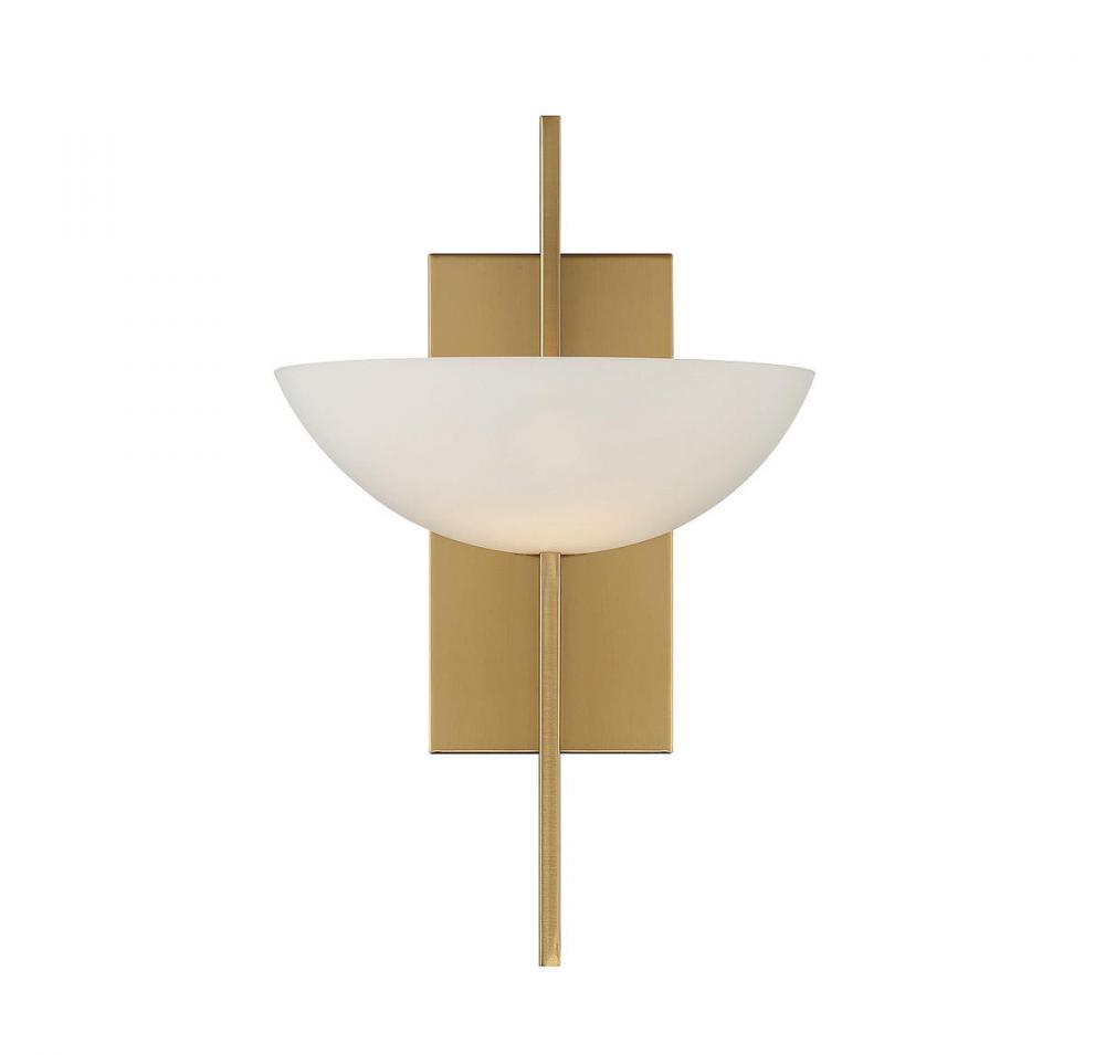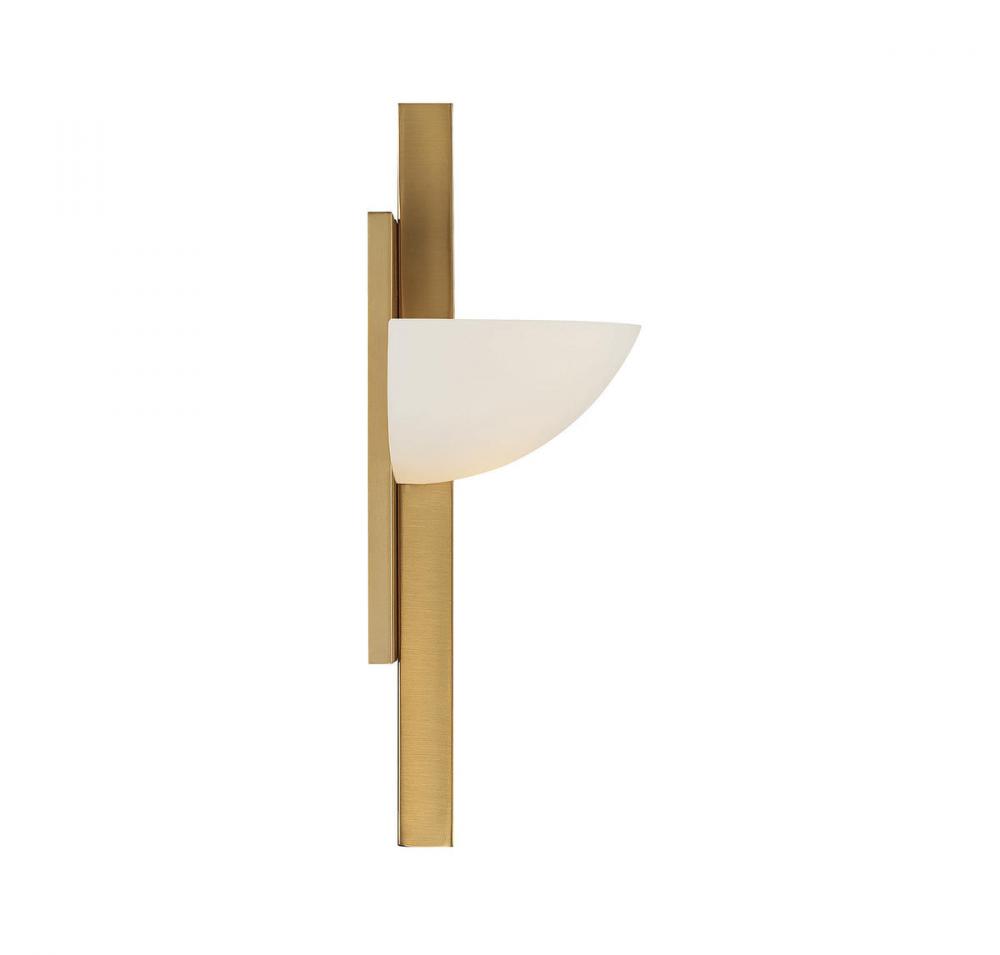The Savoy House Fallon 1-light sconce draws inspiration from Art Deco style, bringing you a look that is both timeless and classic. A generously sized shade of white opal glass and a warm brass finish ensure bright, beautiful illumination. Fallon is 15" in height, 10" in width and extends 5.5" from the wall. Uses one G9 bulb, not included. Damp area rated.
