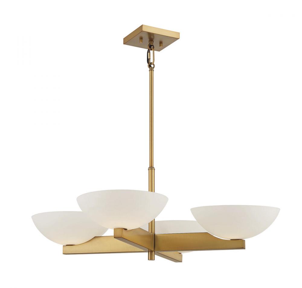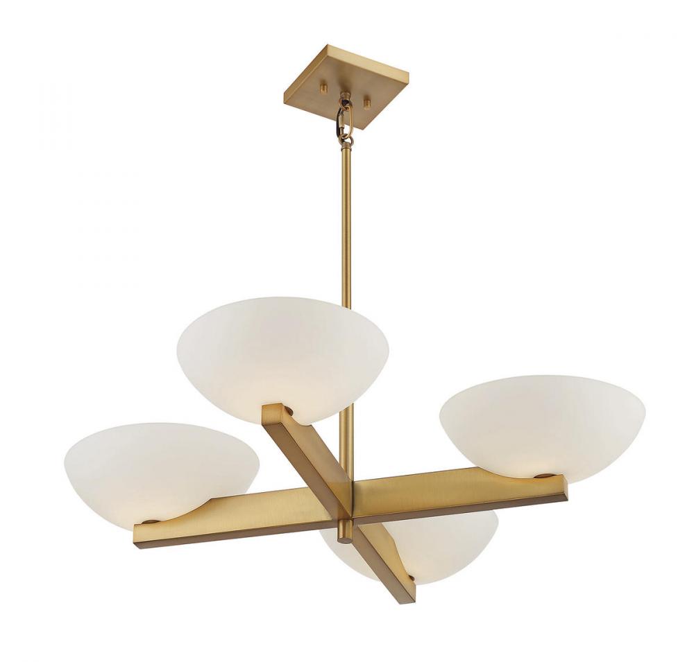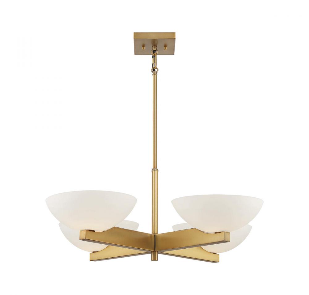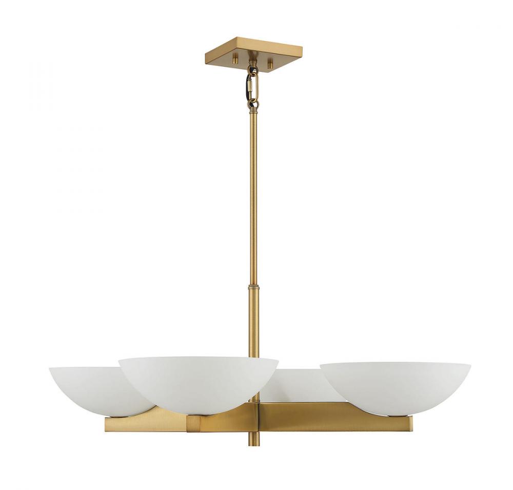 The Savoy House Fallon 4-light chandelier draws inspiration from Art Deco style, bringing you a look that is both timeless and classic. Generously sized shades of white opal glass and a warm brass finish ensure bright, beautiful illumination. Fallon is 30" in width and has an adjustable height ranging from 17" to 63". Uses four G9 bulbs, not included. Comes with four 12" downrods and one 6" downrod, plus 80" of cord.