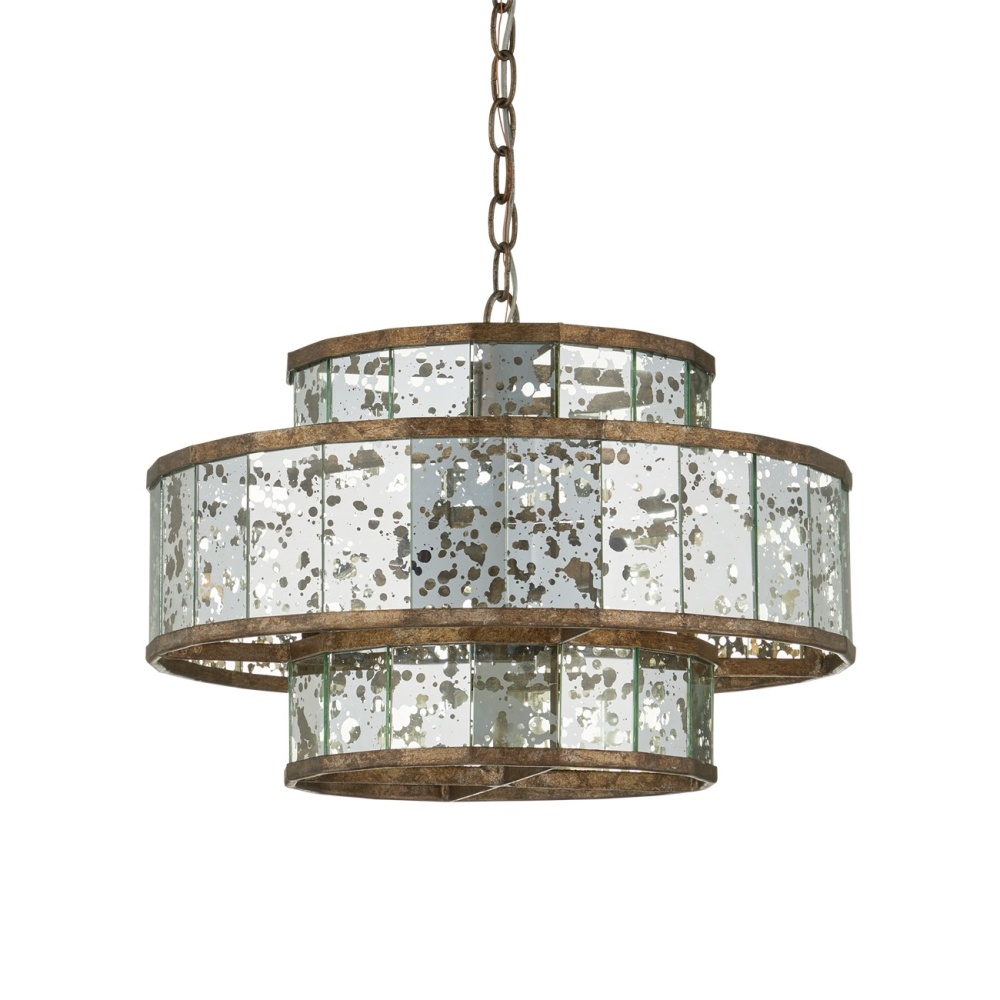 The Fantine Small Chandelier has shades made of Raj mirror that strikingly resemble mercury glass. The Pyrite bronze finish on the metal of this mirrored chandelier echoes the mottled tones in the glass to create synchronicity. The Fantine is also available in a large chandelier and a wall sconce. Adjustable from 20" to 87" with use of included chain/rod kit/cable. If your space calls for a longer drop, additional chain/rods/cable is available for purchase.