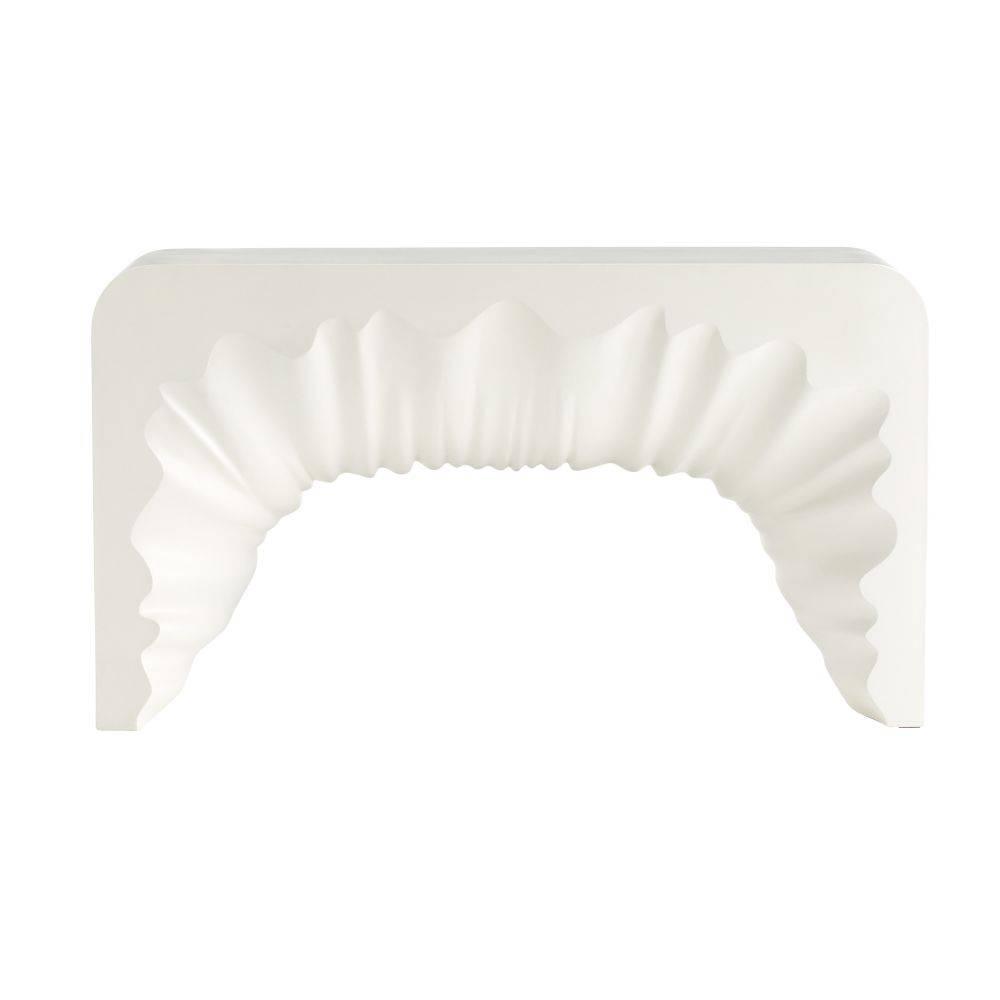 A door frame found in a Spanish mission church inspired the uncommon silhouette of the Farely. Cast of ivory concrete composite, this reinvented architectural form also resembles the natural grooves of a conch shell. Its smart scale works on an elevated patio, in a coastal-inspired indoor dining room or commercial space.