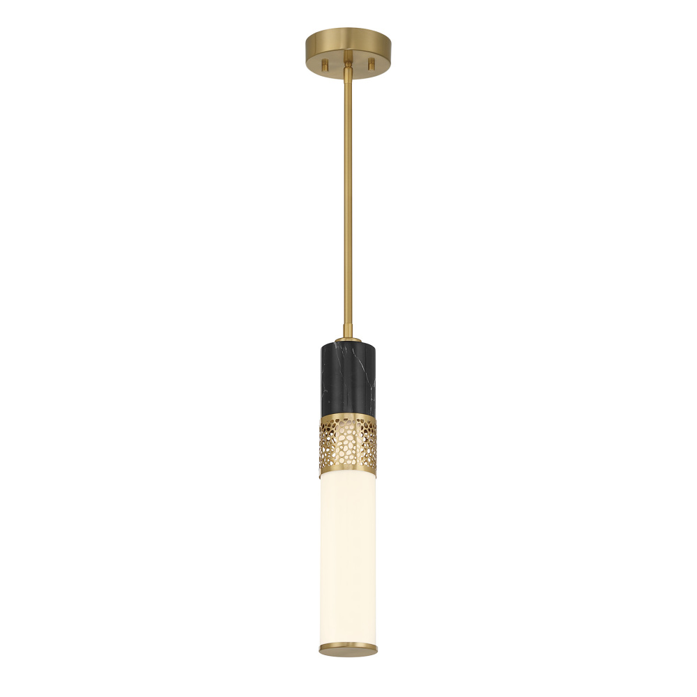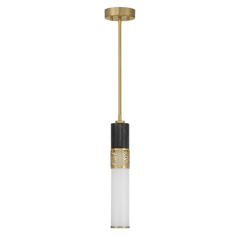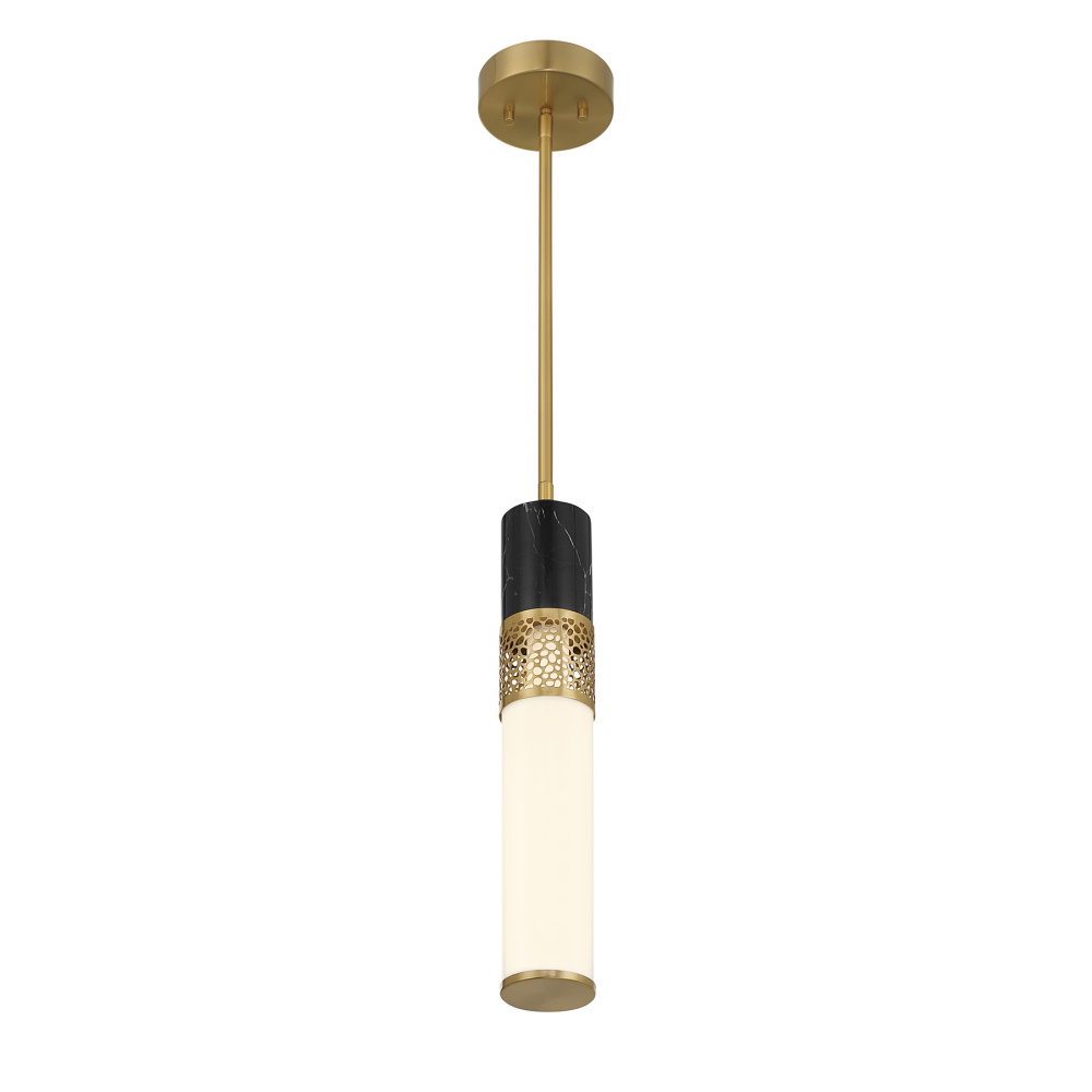 The Savoy House Farrell LED pendant was designed by Dann Foley, an award-winning interior designer celebrated for his refined style and artistic expression. A white opal glass tube is wrapped in laser-cut detailing and topped with a natural black marble accent for a distinctive finishing touch. The Warm Brass finish amplifies its radiant presence. Farrell is 3.13" in width and has an adjustable height ranging from 18" to 72". Comes with four 12" downrods and one 6" downrod.