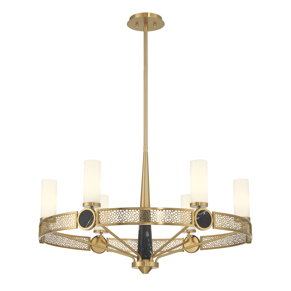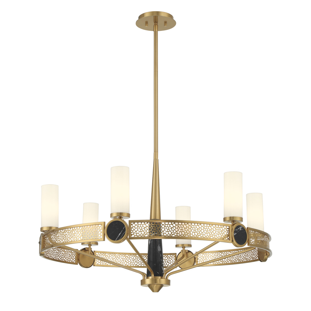 The Savoy House Farrell 6-light chandelier was designed by Dann Foley, an award-winning interior designer known for sophisticated craftsmanship and attention to detail. Tubes of white opal glass join with intricate laser-cut patterns and bold accents of natural black marble, creating a beautifully layered, luxurious statement. The Warm Brass finish enriches the look with a welcoming glow. Farrell is 32" in width and has an adjustable height ranging from 19.63" to 73.63". Uses six candelabra size bulbs of up to 60 watts per bulb. Bulbs not included. Comes with four 12" downrods and one 6" downrod.