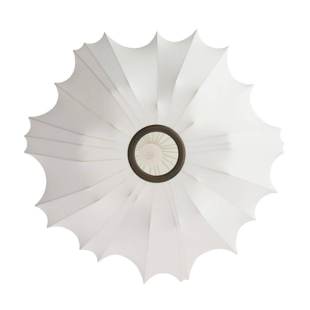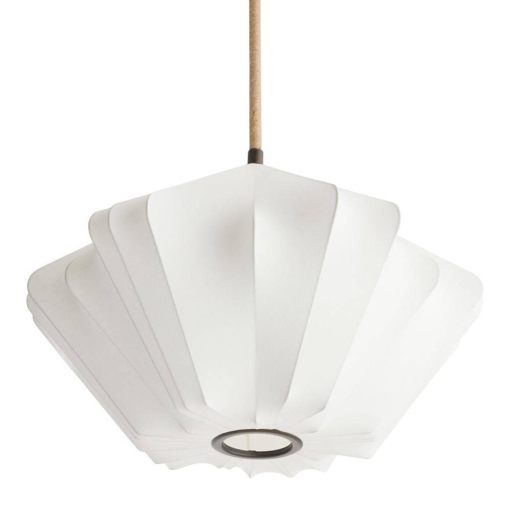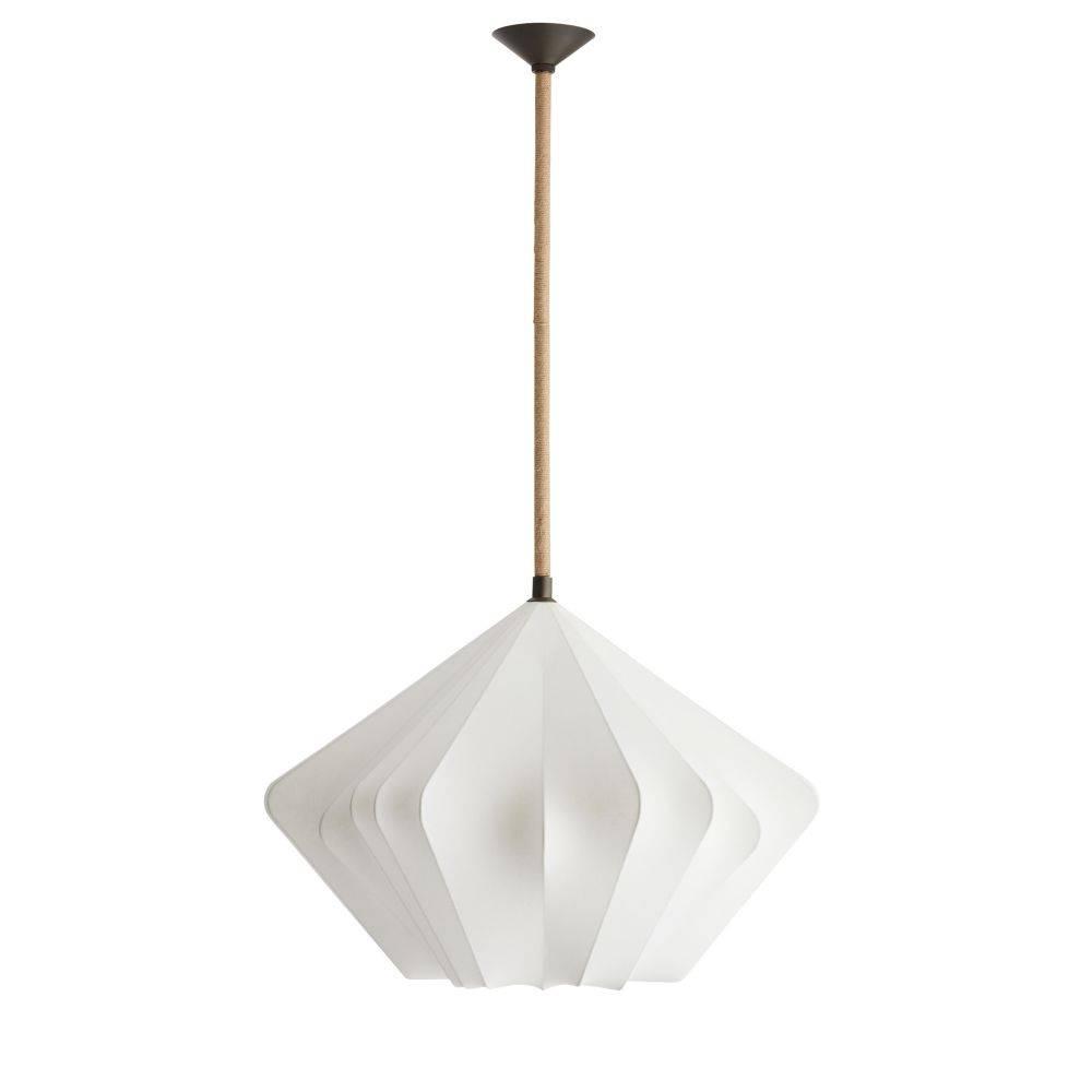 Our ivory faux vellum stretches over a strong-lined frame of English bronze-plated steel. Suspended from a natural rope-wrapped pipe, its echoing form evokes the movement of a dance. Open at the bottom to let the light permeate. Damp-rated, although limited covered outdoor areas may affect finish. Finish will vary.