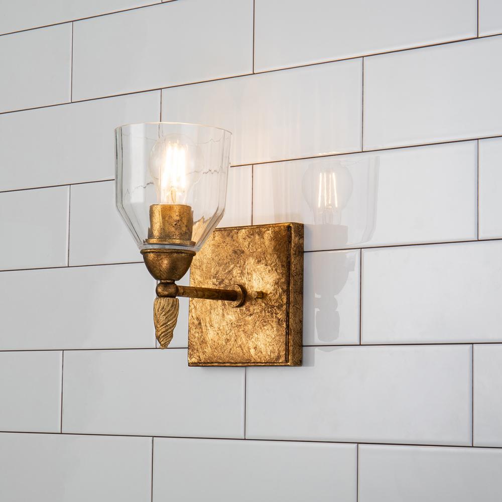 The Felice 1-Light Vanity Sconce blends classic and modern design with a antique gold finish, gold finial, and dome-shaped glass shade. Perfect for bathrooms or artwork, its timeless style adds elegance to any space. Damp-rated and easy to install.
