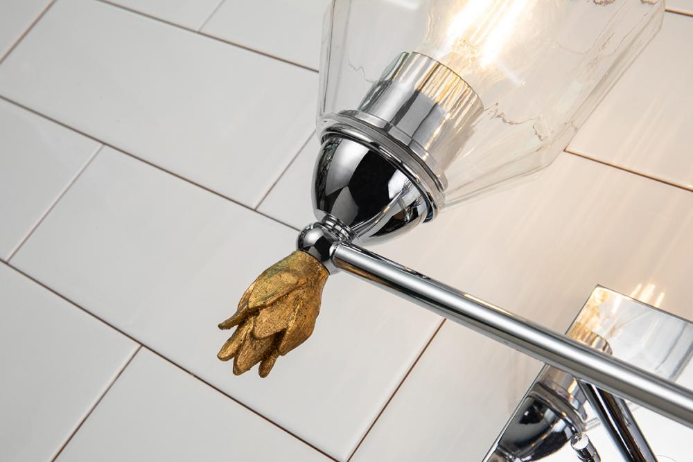The Felice 2-Light Vanity Sconce blends classic and modern design with a polished chrome finish, gold finial, and dome-shaped glass shade. Perfect for bathrooms or artwork, its timeless style adds elegance to any space. Damp-rated and easy to install.