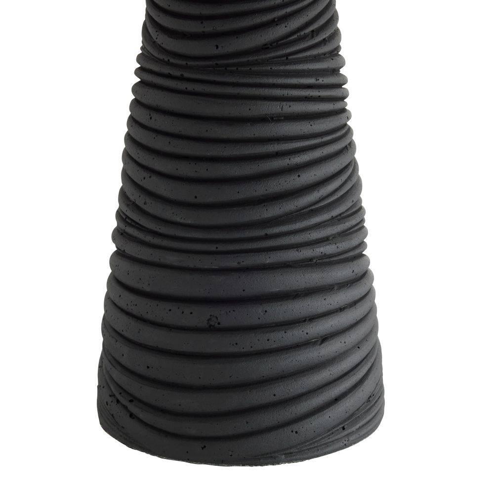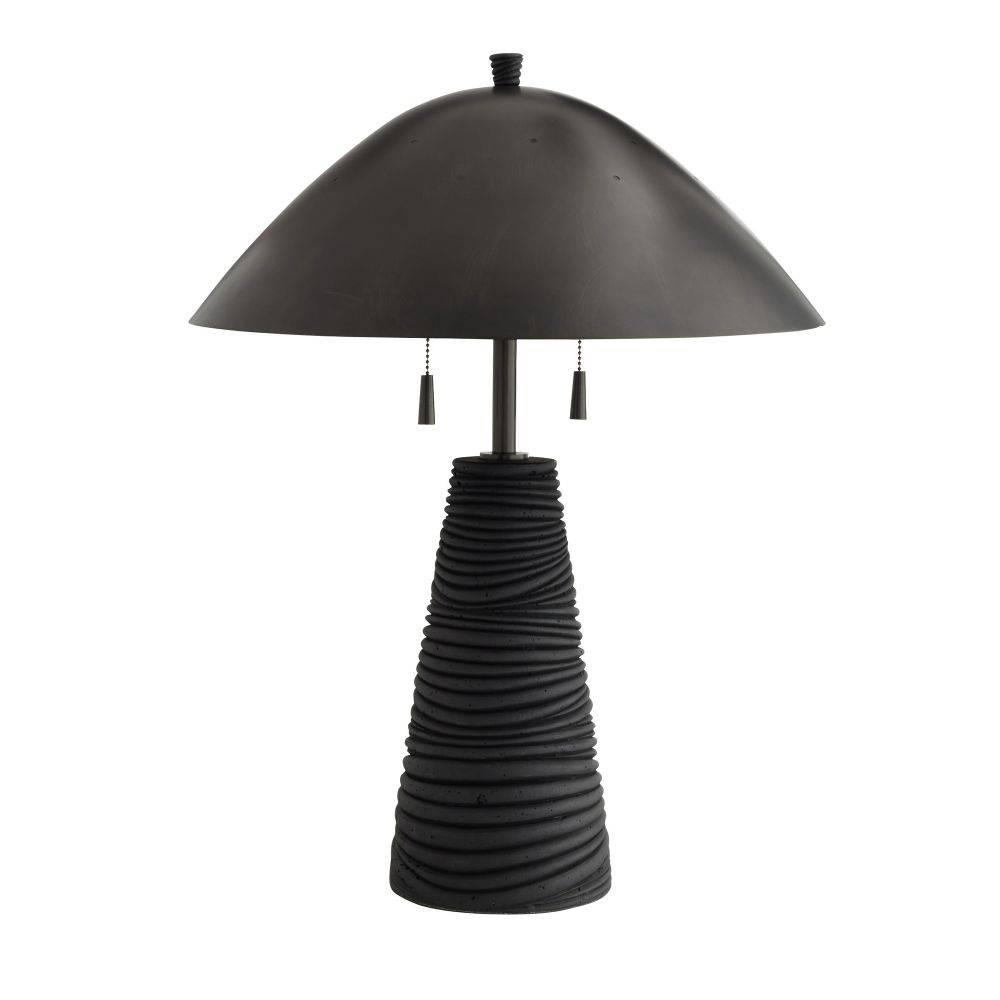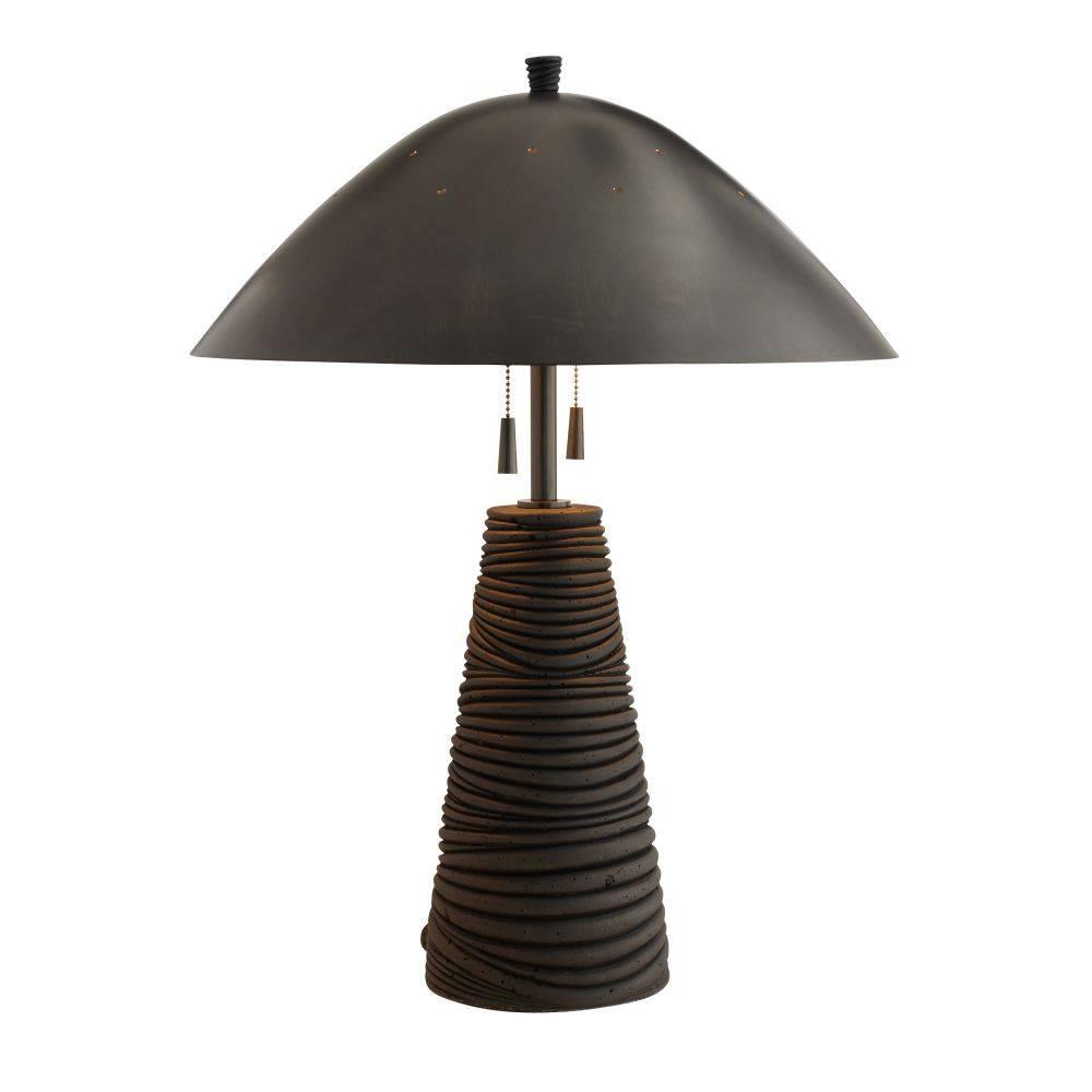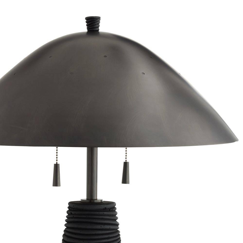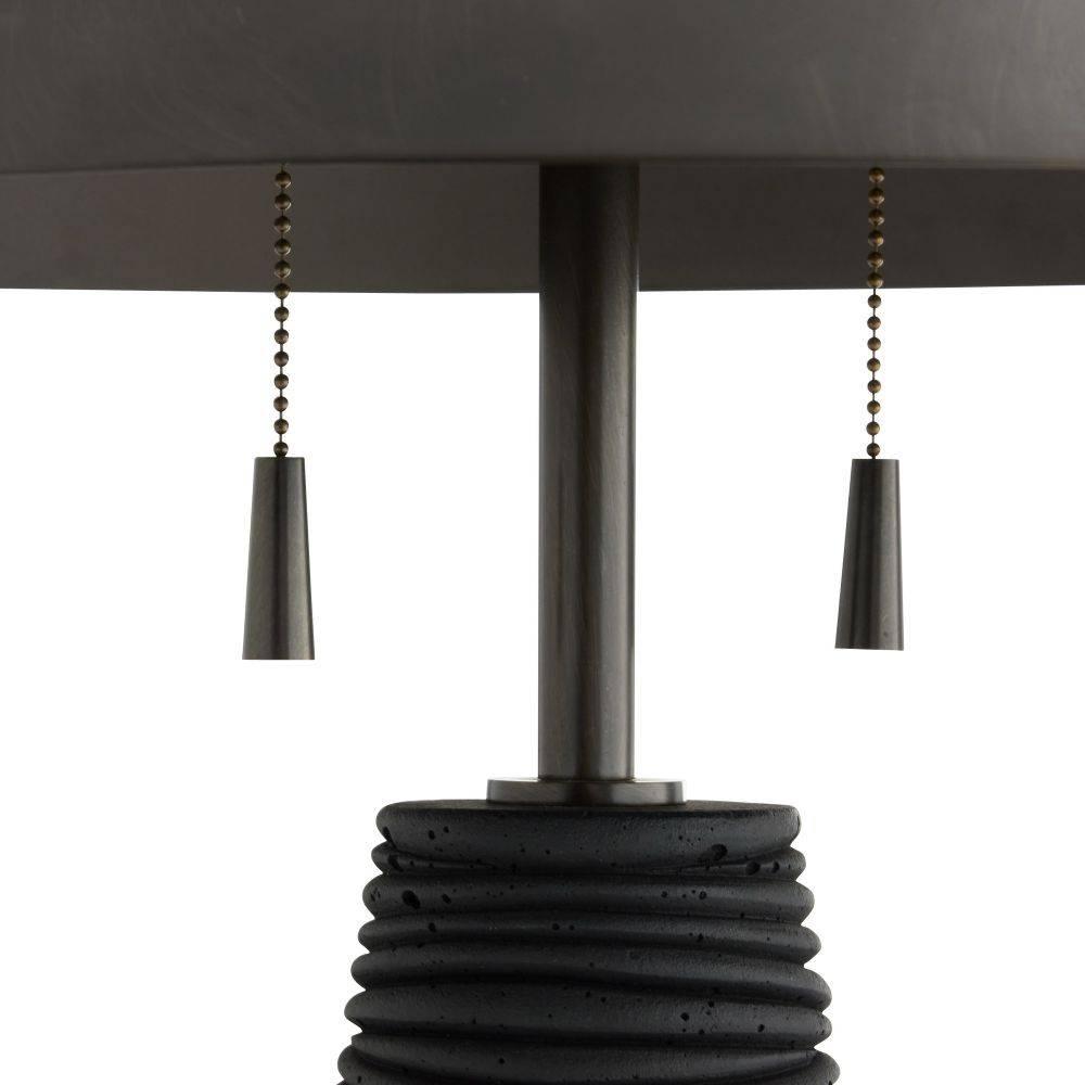 Crafted of black lava stone composite, the Fender has an eroded, ridged surface that lends textural intrigue. A helmet-like shade of bronze-plated steel reflects light to lend a moody vibe to any surface. Matching swirl texture finial and double bronze pull chains.