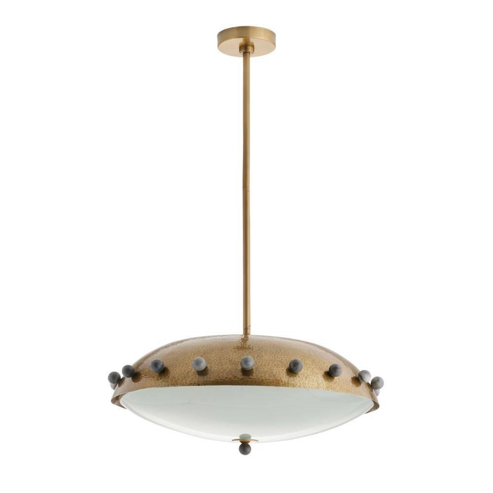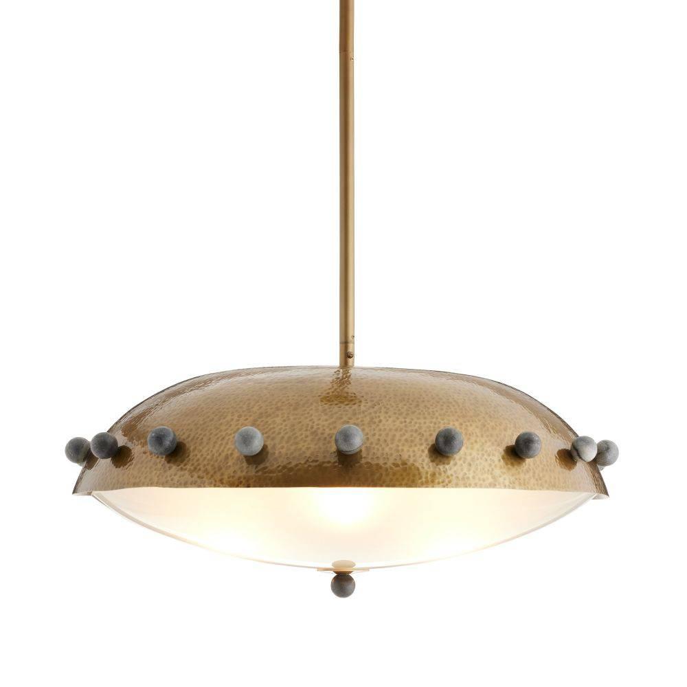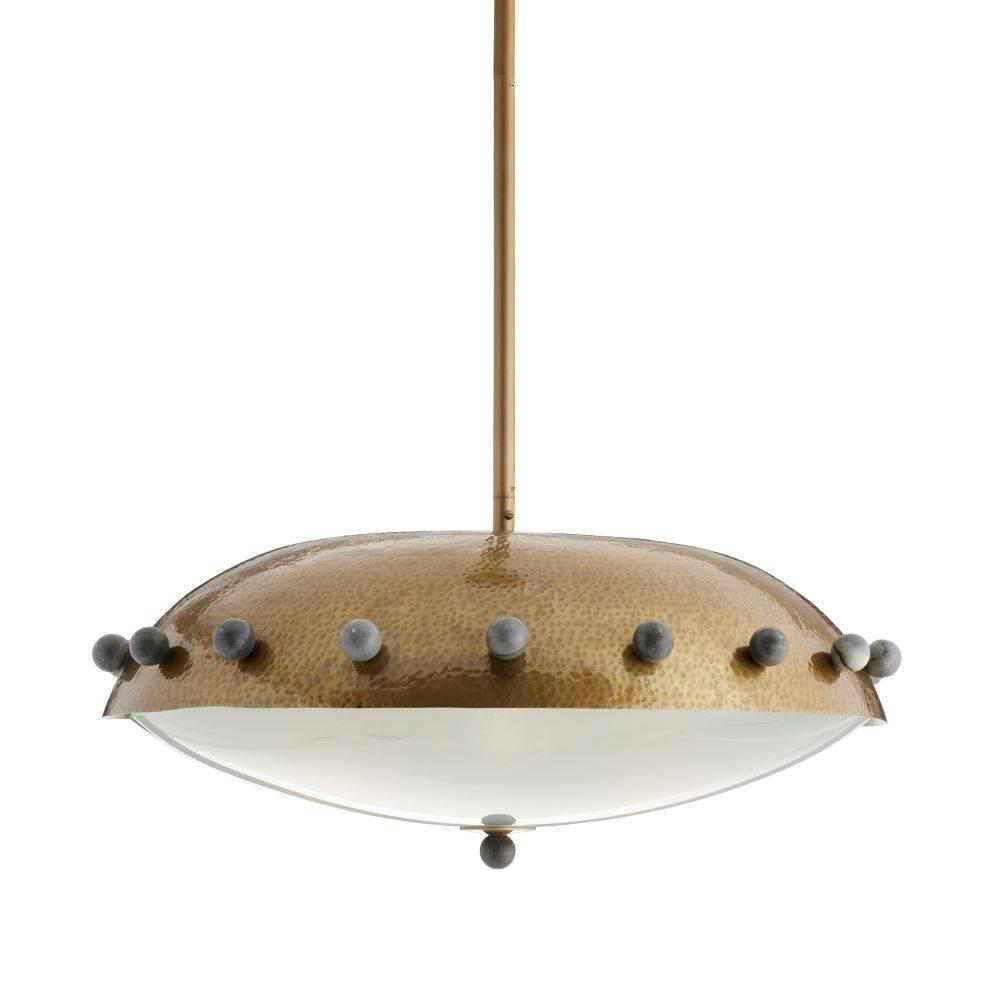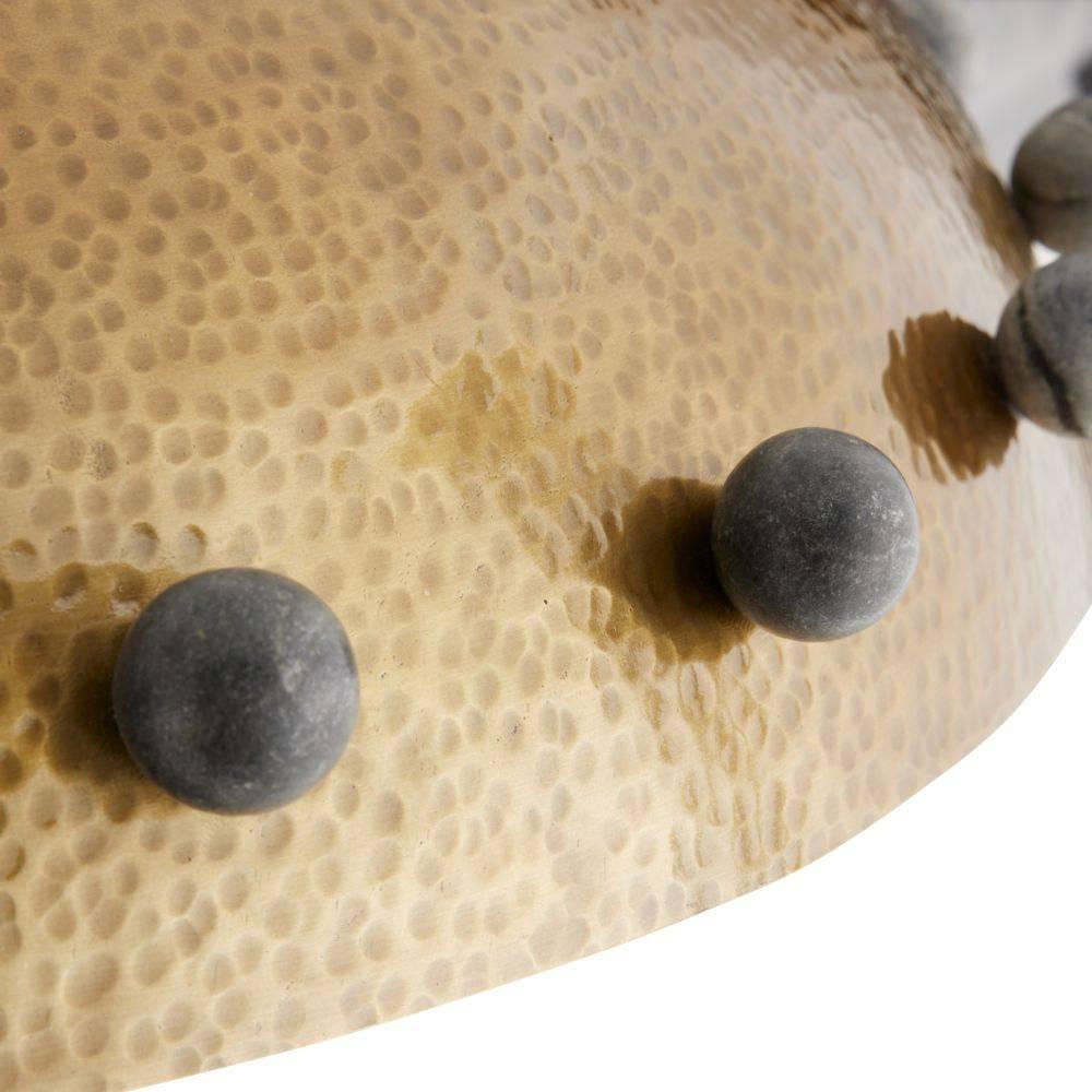 Reminiscent of armor or a shield, a dome shade of antique brass-plated iron is hand-hammered for a textural finish. Studded all around the perimeter with spheres of black marble, it is impactful when hung alone or in multiples. Underneath the frosted glass diffuser, three bulbs emit a subtle glow. Damp-rated, although limited covered outdoor areas may affect finish. Finish will vary.