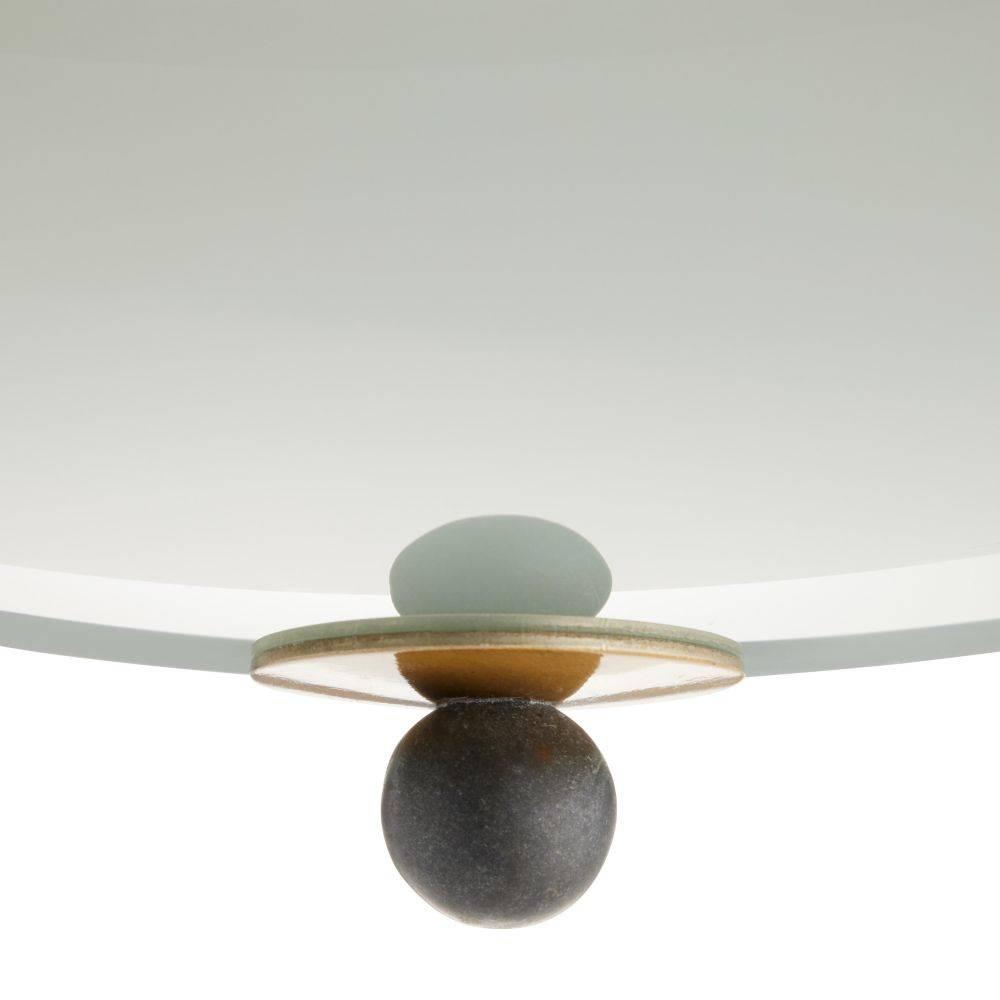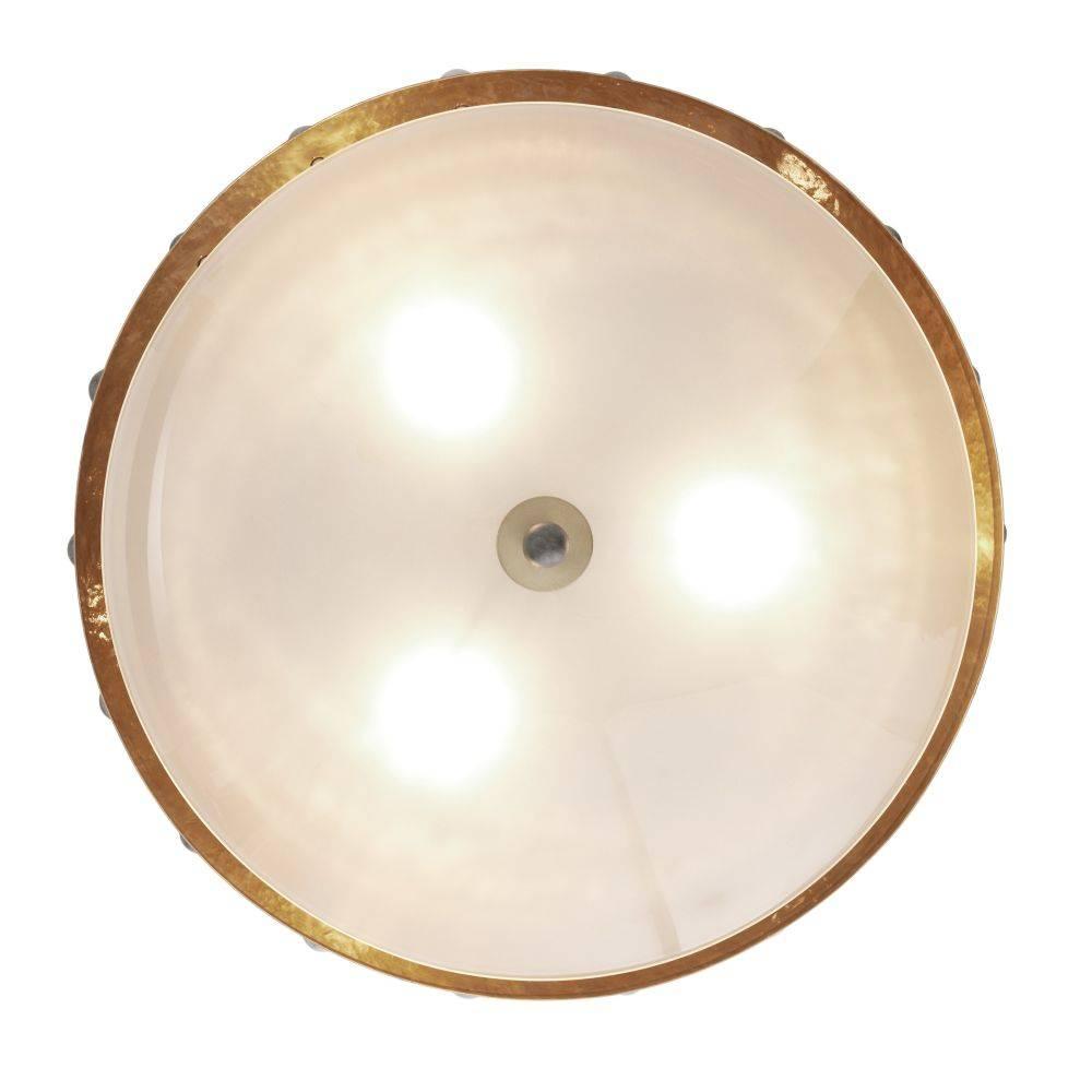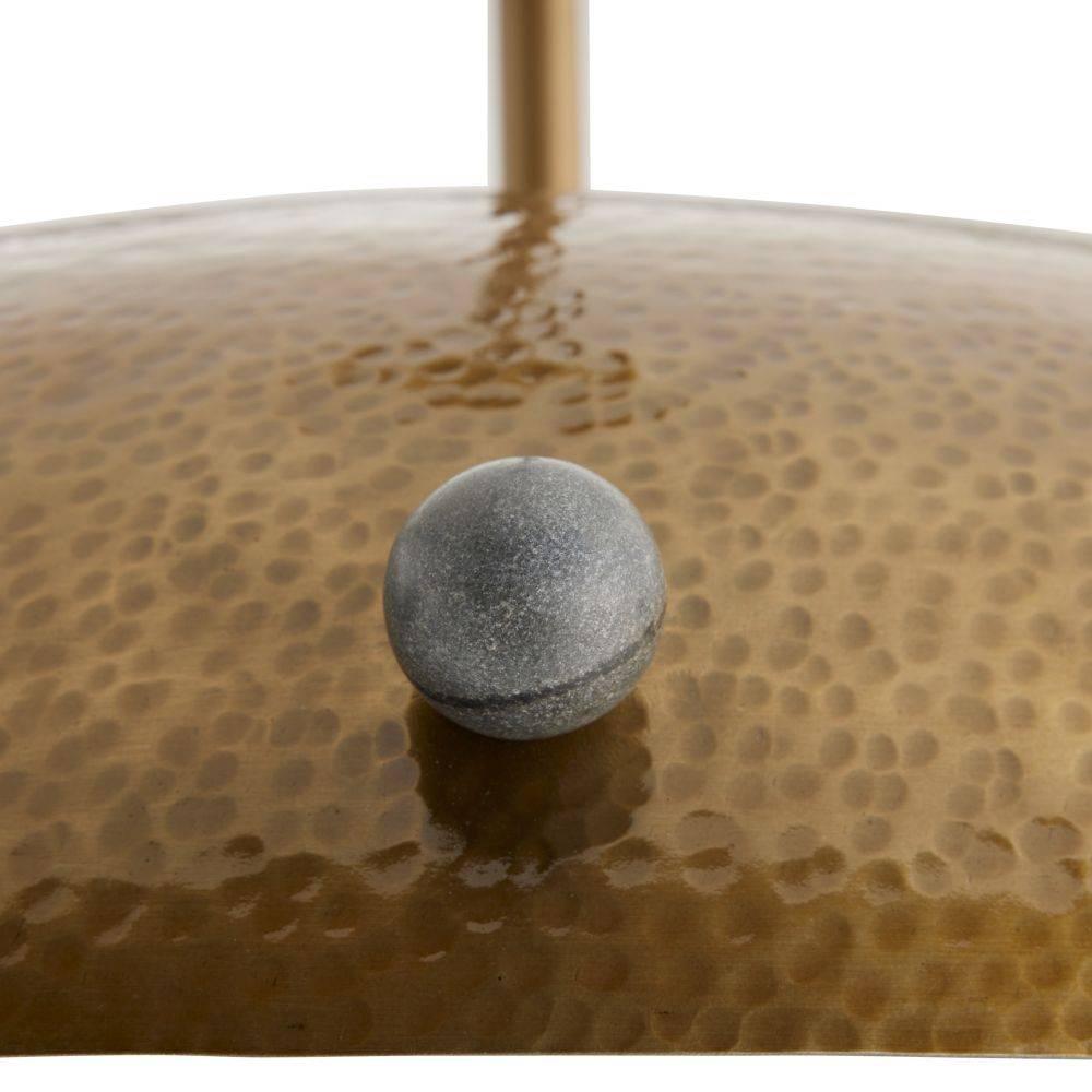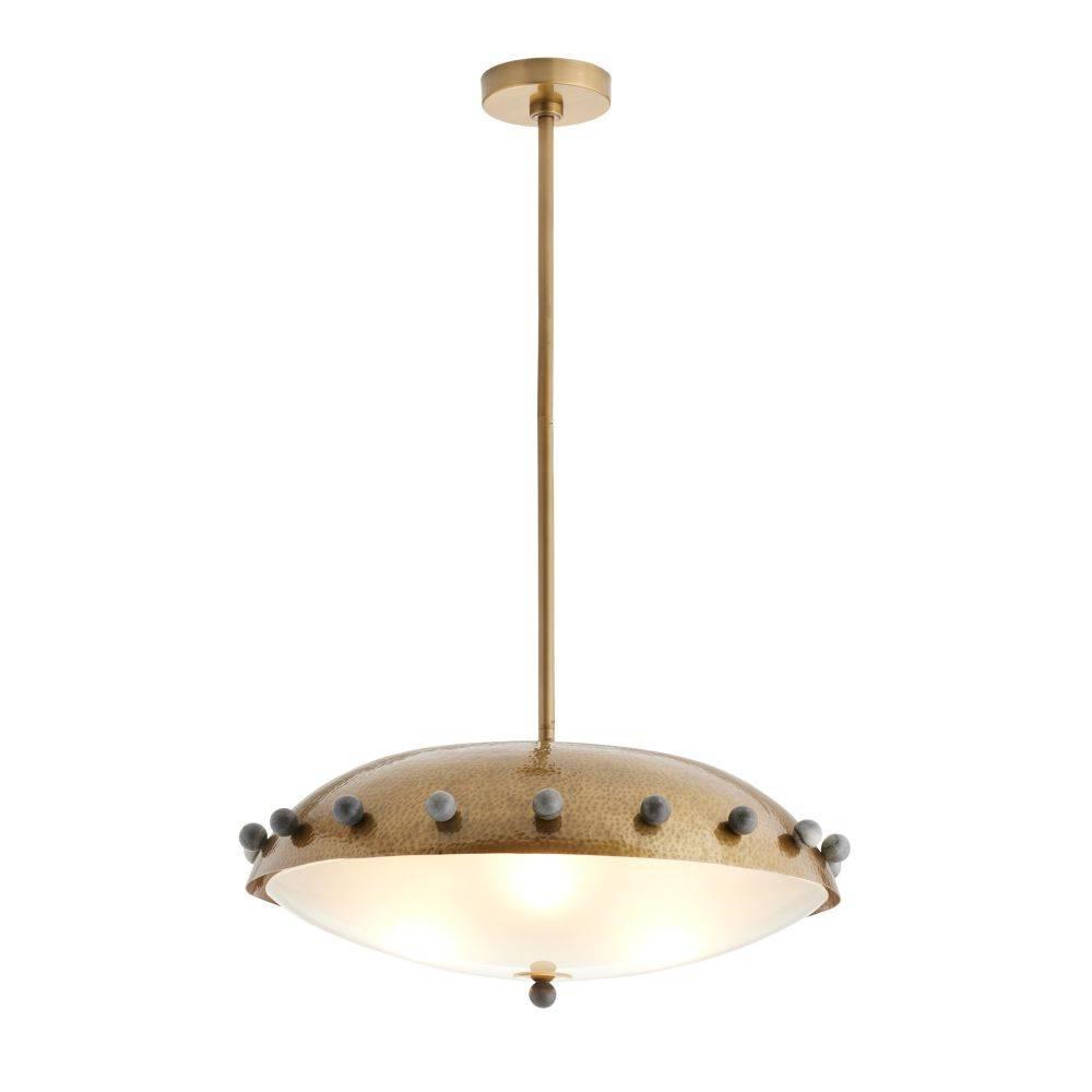 Reminiscent of armor or a shield, a dome shade of antique brass-plated iron is hand-hammered for a textural finish. Studded all around the perimeter with spheres of black marble, it is impactful when hung alone or in multiples. Underneath the frosted glass diffuser, three bulbs emit a subtle glow. Damp-rated, although limited covered outdoor areas may affect finish. Finish will vary.