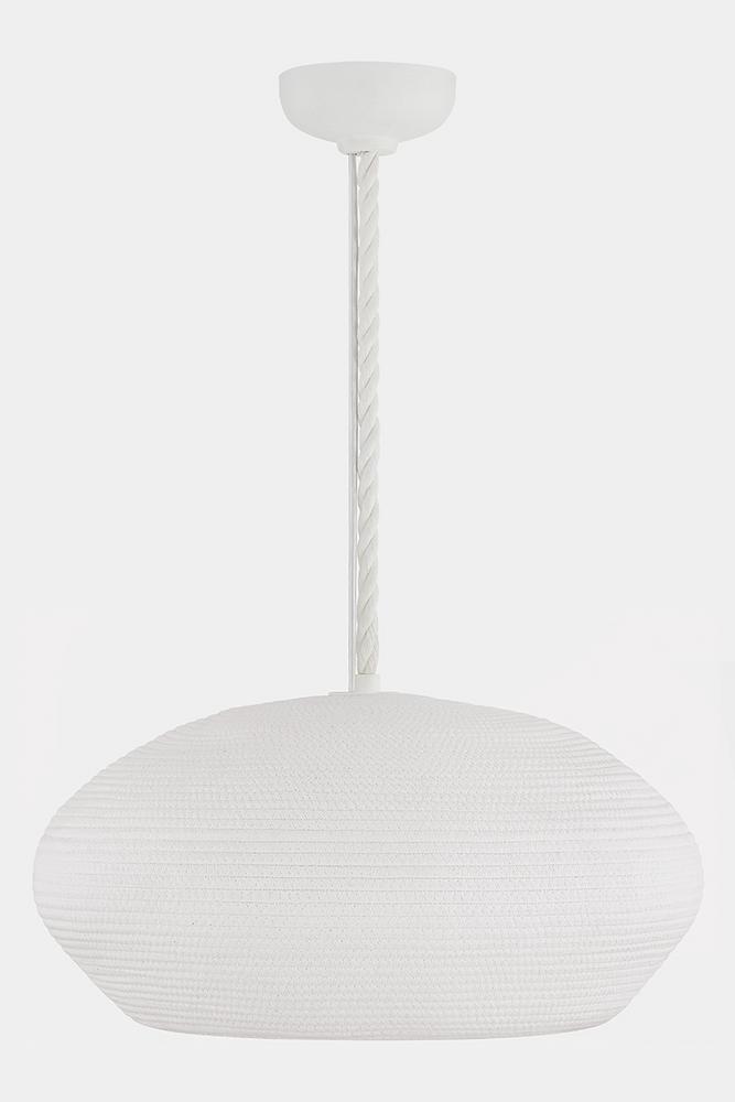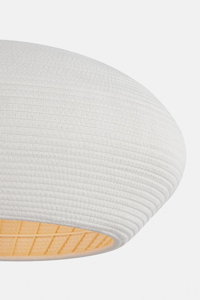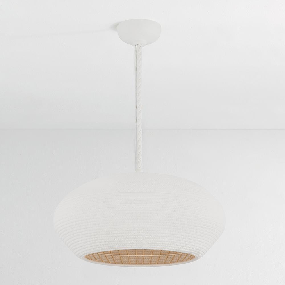 Entirely handcrafted from white coiled cotton cord, the Fishkill pendant is a pure expression of materiality. The small gaps between the coils allow light to escape, creating a warm, glowing effect that fills the entire shade. Available in two sizes, Ferndale lends a fresh, airy quality to contemporary spaces. Due to the one-of-a-kind nature of the medium, exact colors and patterns may vary slightly from the image shown.