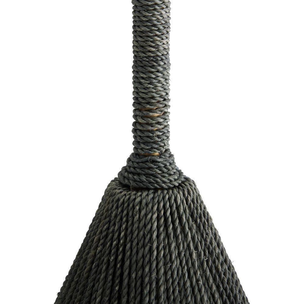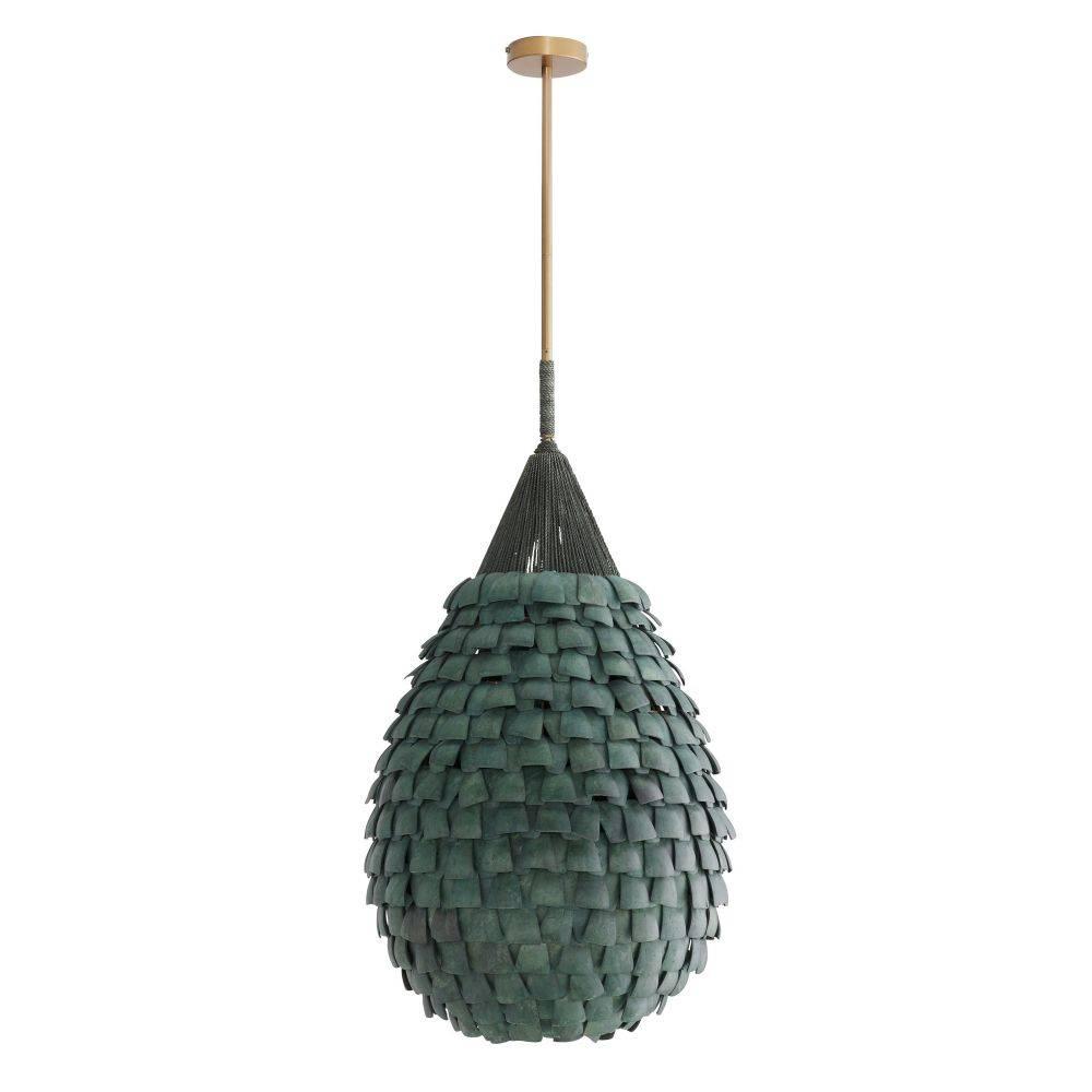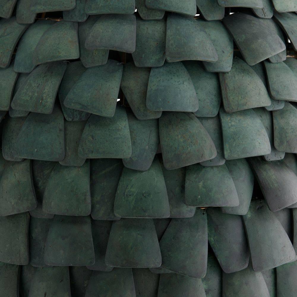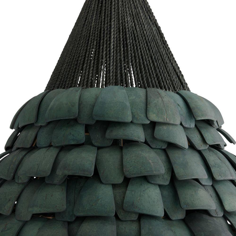 Shingles of eucalyptus hue stained coco shells are layered for a fish scale effect on an armature of antique brass-plated iron. Suspended from strands of dark eucalyptus stained abaca rope, the Ferndale style is anchored by an antique brass iron pipe finished with carefully wrapped details. Finish will vary.