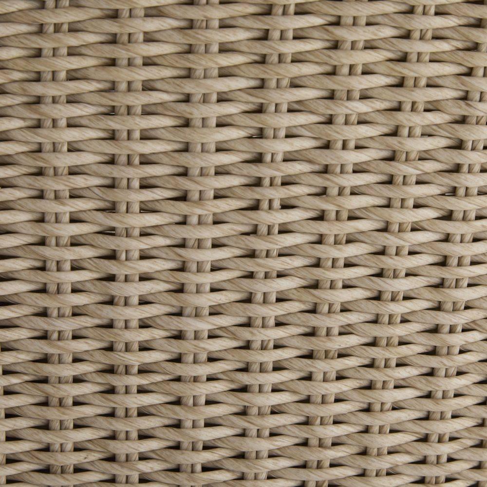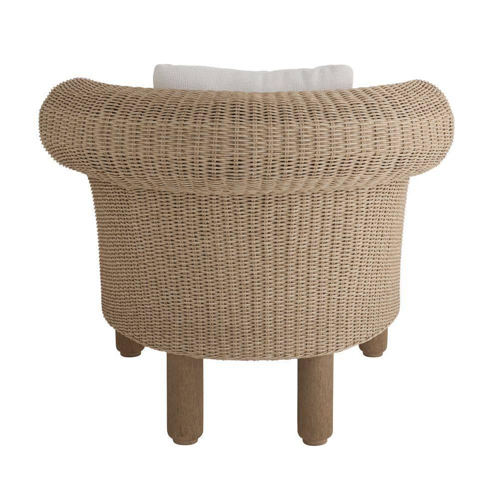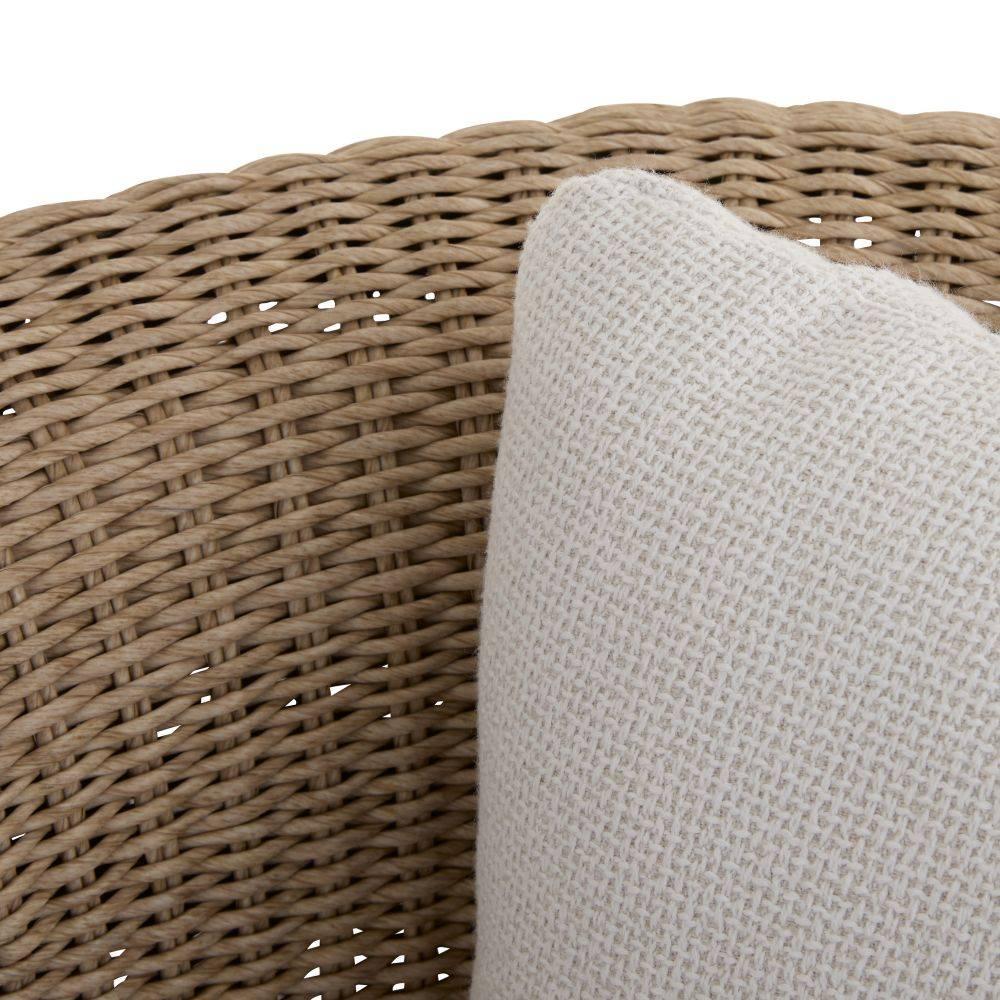 Like a woven shrug, the fashionable form of this dune twisted synthetic rattan seat was designed to cradle the body like a hug. The playful yet contemporary form is overscaled, with wheat teak wood legs and roll edges. Our Pearl Outdoor Performance Bouclé cushion and lumbar pillow are attached with Velcro. Finish will vary.