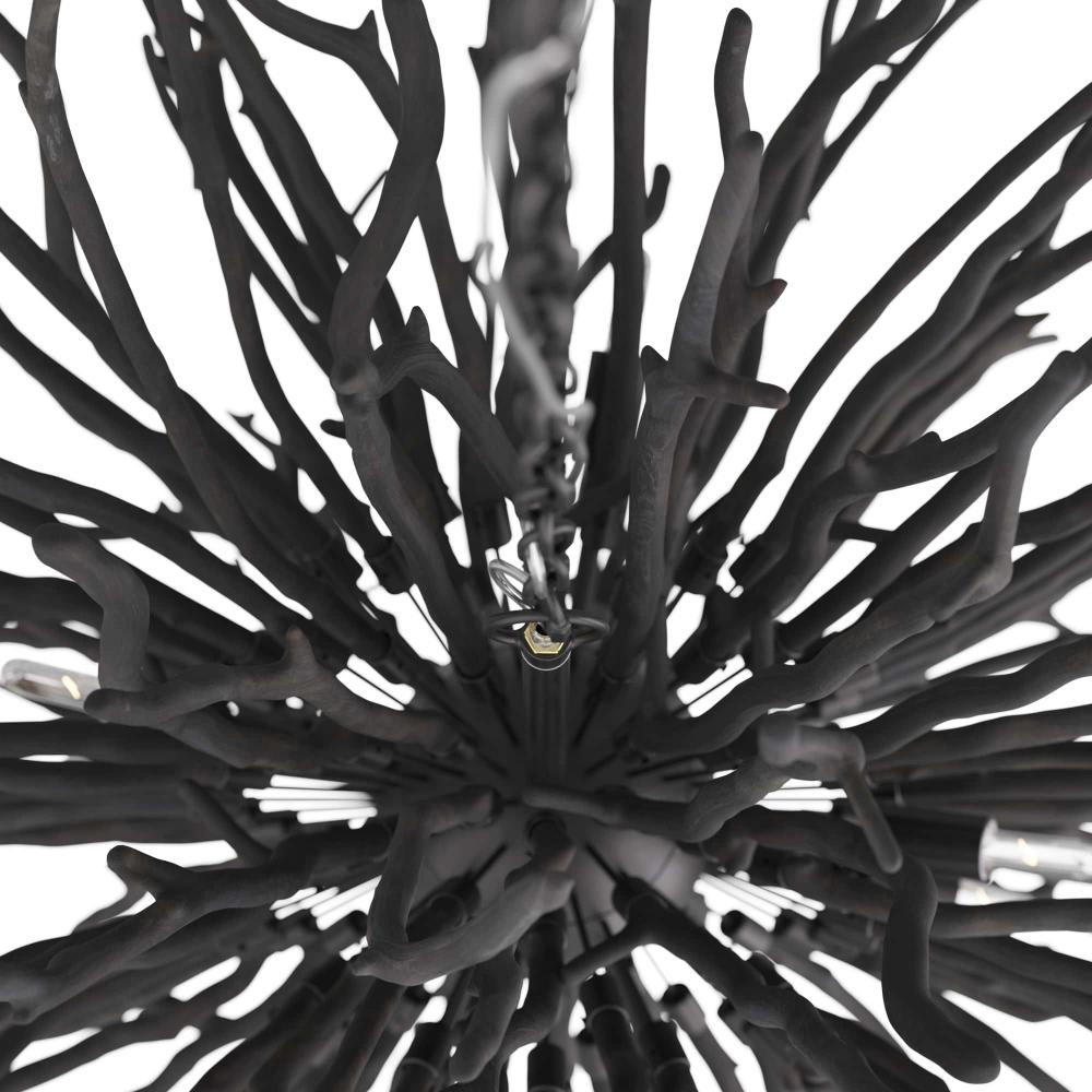 AN ORGANIC TAKE ON THE CLASSIC STARBURST DESIGN, THE FINCH CHANDELIER FEATURES DARK GRAY-WASHED BRANCHES GROWING FROM A CONCEALED BLACK IRON FRAME. EACH OF THE EIGHT LIGHTS SEEMINGLY BLEND INTO THE STRUCTURE UNTIL THEY BRING IT TO LIFE WHEN LIT, CASTING BEAUTIFUL SHADOWS ACROSS A SPACE. DUE TO THE NATURE OF THE WOOD, EACH PIECE WILL VARY IN SIZE, SHAPE, AND FINISH. THE WOODEN STICKS WILL CRACK OVER TIME; THIS IS AN INHERENT FEATURE OF SOLID WOOD OF THIS PROPORTION.