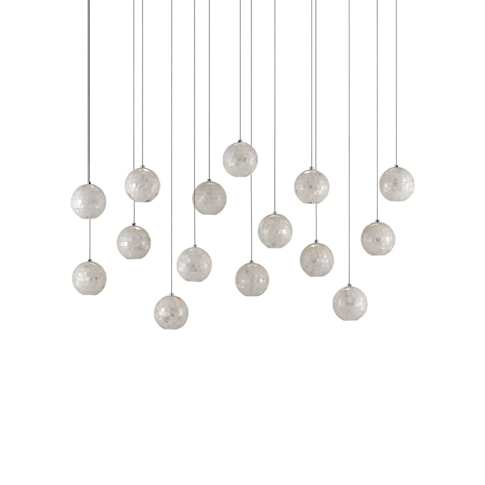 The Finhorn Rectangular 15-Light Multi-Drop Pendant has orb-shaped shades covered with small squares of mother of pearl, painstakingly hand-applied. The canopy of this piece is luminous in a painted silver finish. This fixture is among Currey & Company's multi-drop pendant collection, which includes multiple configurations.