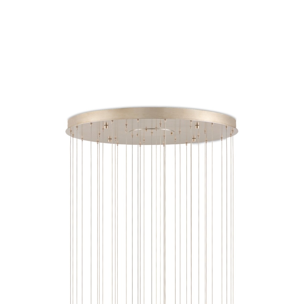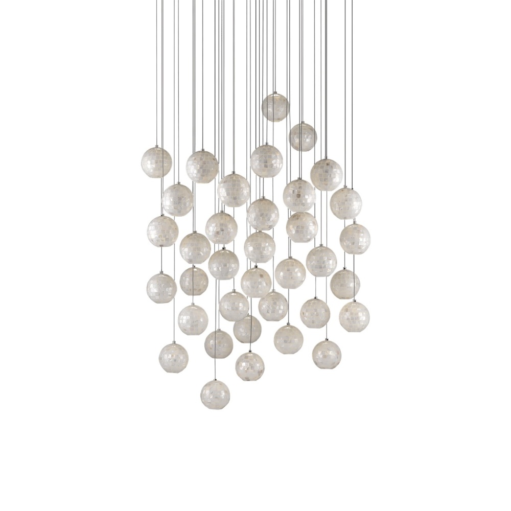 The Finhorn 36-Light Multi-Drop Pendant has orb-shaped shades covered with small squares of mother of pearl, painstakingly hand-applied. The canopy of this piece is luminous in a painted silver finish. This fixture is among Currey & Company's multi-drop pendant collection, which includes multiple configurations.