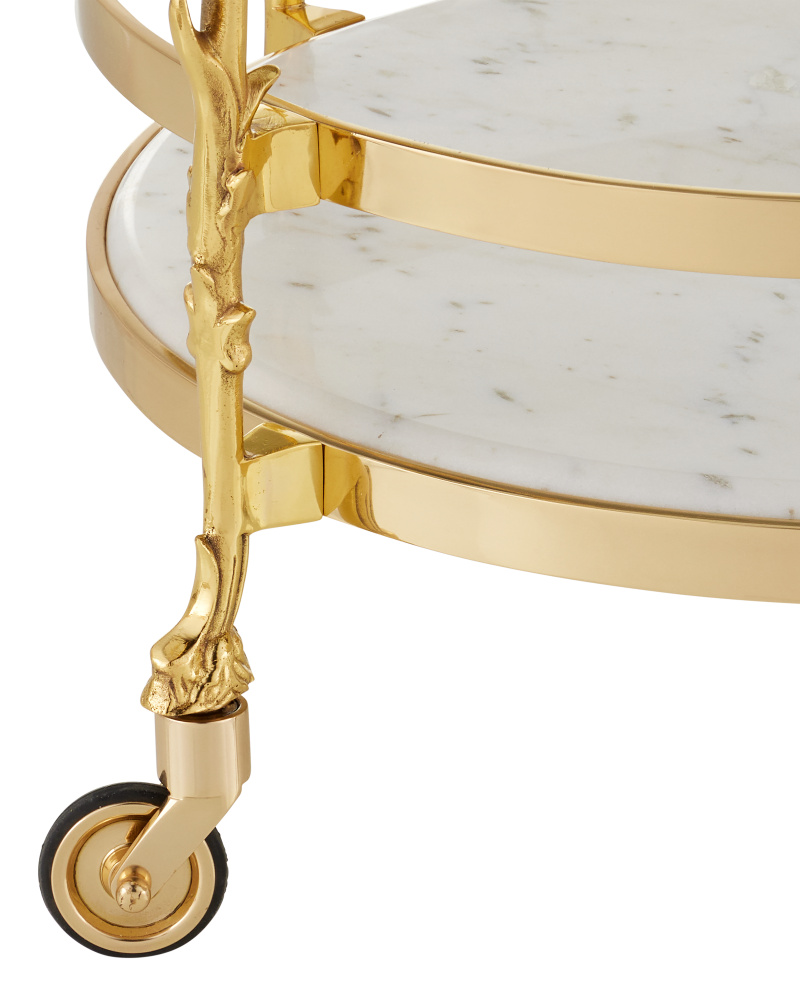 Reflecting its beautiful name, which means flower in Italian, the Fiore Bar Cart has lovely floral motifs flowing up each of its legs toward a metal band into which a glass top is inset. Just above the graceful ball-shaped feet fitted with non-marring casters sits a natural white marble shelf, the stone a crisp contrast to the luminous polished brass finish.