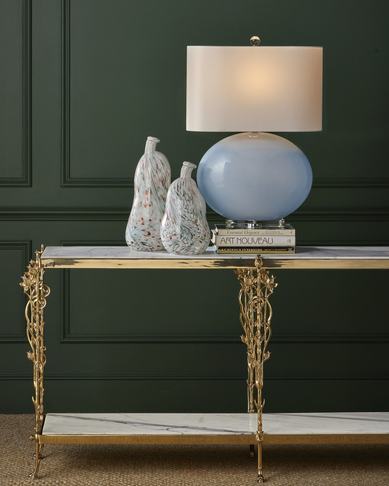 Reflecting its beautiful name, which means flower in Italian, the Fiore Console Table has lovely floral motifs flowing up each of its legs toward a metal band into which a natural white marble top is inset. Just above the graceful ball-shaped feet, another shelf sits, the natural stone a crisp contrast to the luminous polished brass finish.