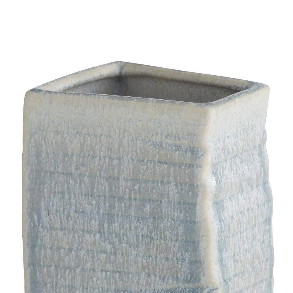 Abstract botanical elements lend a textural finish to a trio of ceramic vases. With a texture reminiscent of palm fronds, each is hand-cast, then glazed in an icy morn shade with subtle gradations of color. Finish will vary.