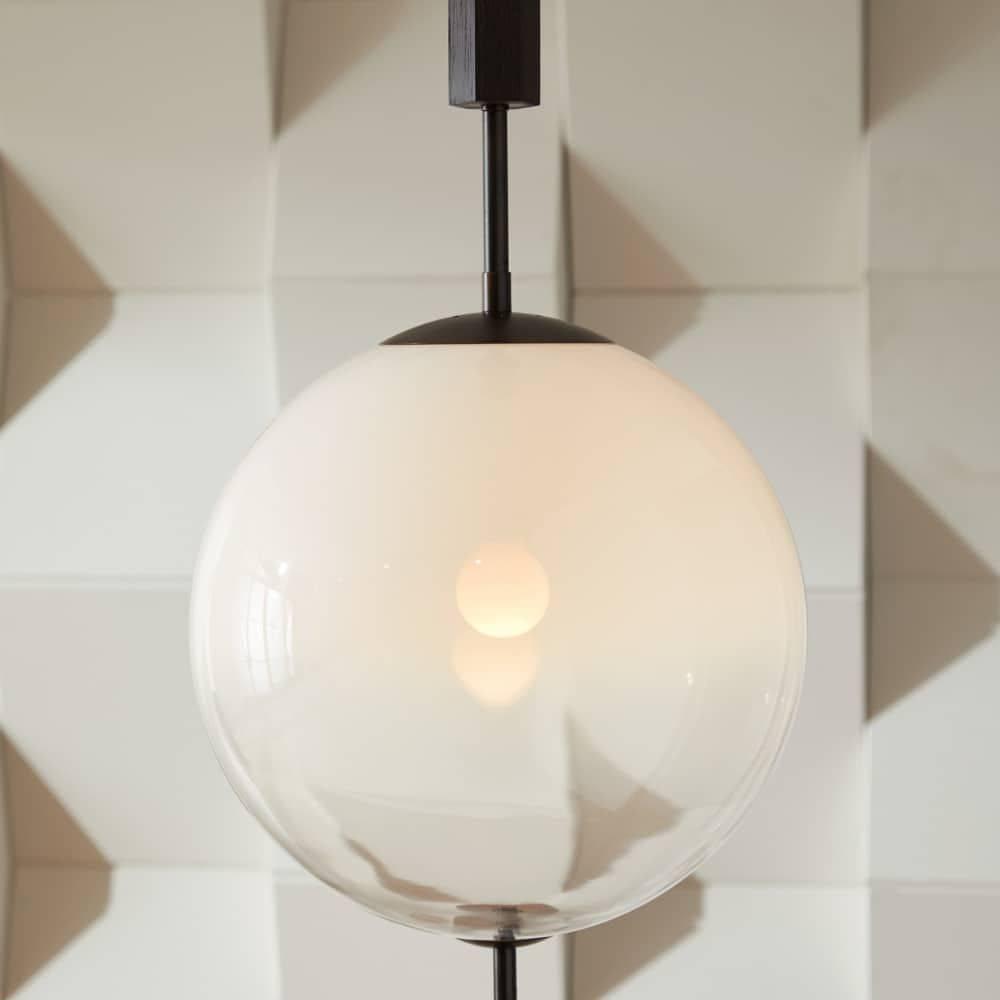 We created this architecturally inspired lamp with a subtle nod to 1970’s-style modernism. A large-scale orb shade of our new frost ombre glass is balanced between English bronze-plated steel hardware, while a faceted wood cuff detail draws the eye upward. Stellar on its own, it is even more impactful when installed in multiples. Damp-rated, although limited covered outdoor areas may affect finish. Finish will vary.