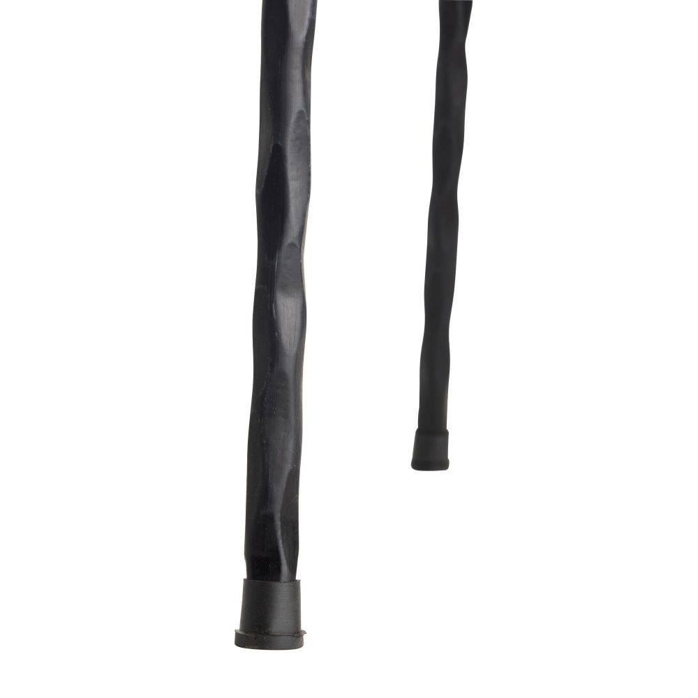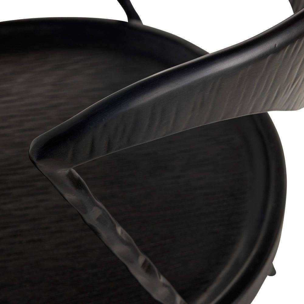 Designed to hug the body, a contemporary modern chair possesses a curved integrated metal back inspired by a suspension bridge. The recessed seat of ebony mango wood is paired with angled legs of blackened iron, delivering a look of lightness and ease belied by this style's substantial base.