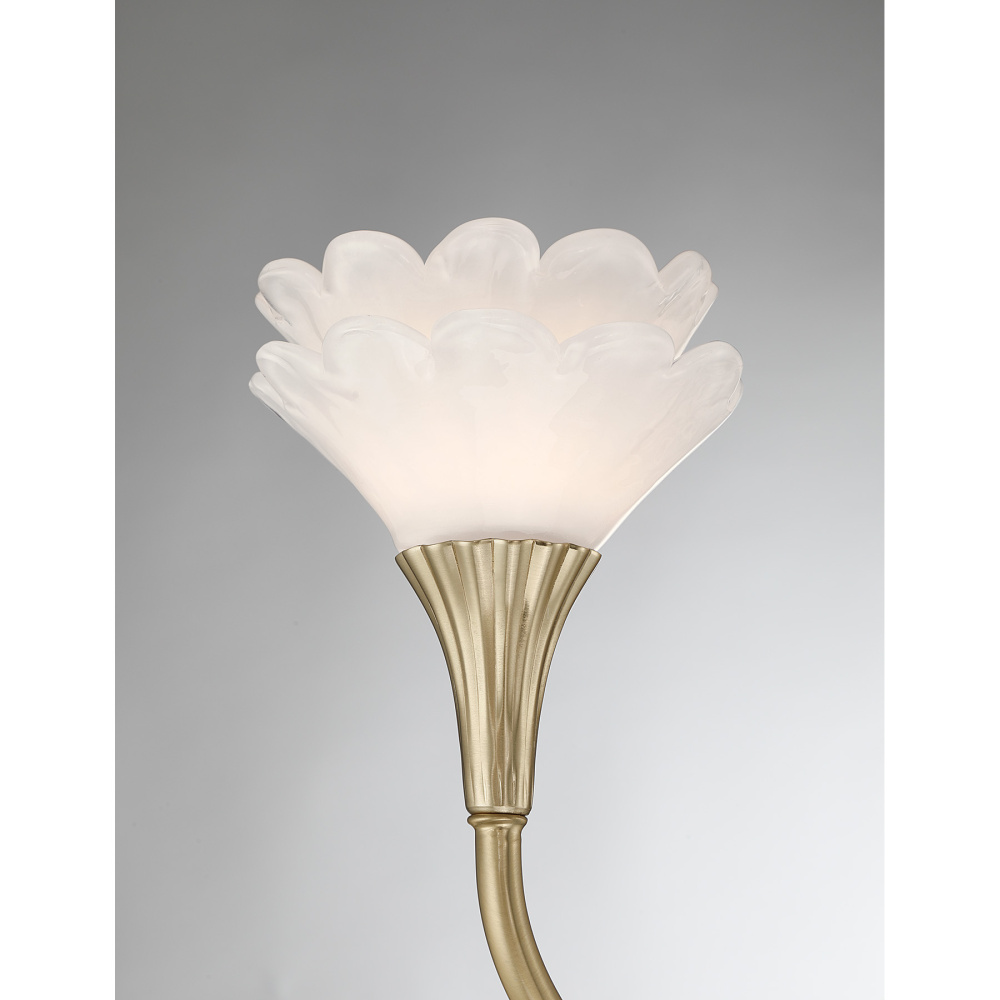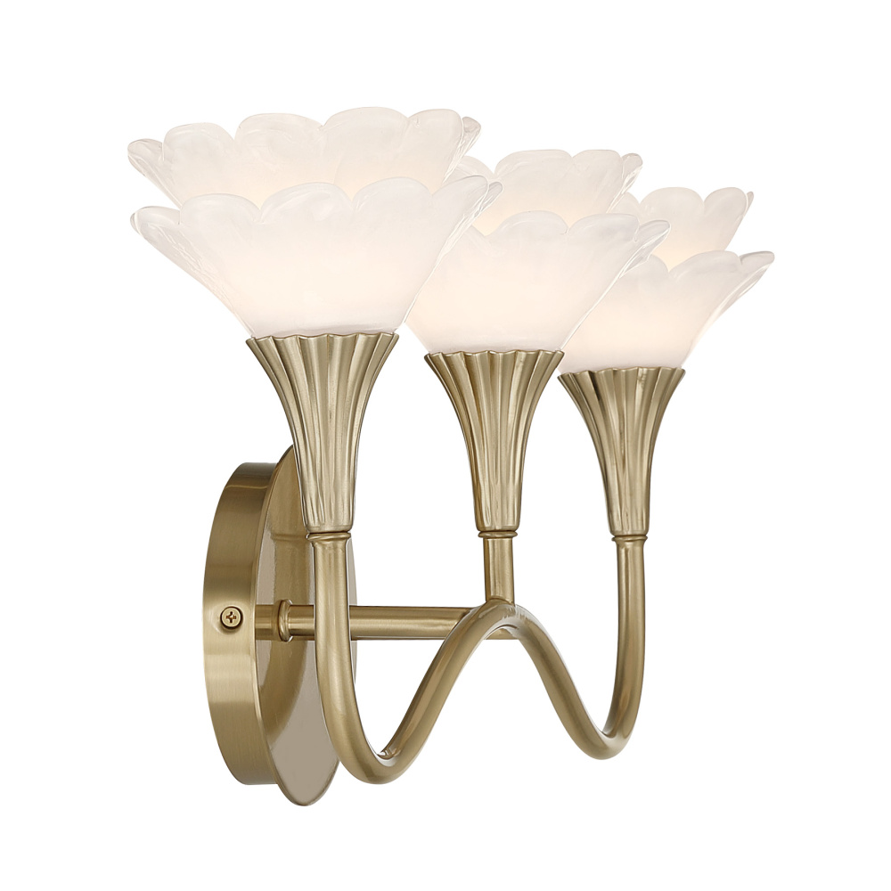 The Savoy House Florena 3-light bath vanity light showcases three pairs of handmade pearlescent white glass flowers, each one arranged as though blossoming along the gently arced arms. The Noble Brass finish enhances the natural glow, bringing a refined beauty to the room. Florena is 9" in height, 22" in width and extends 6" from the wall. It uses three G9 bulbs of up to 6 watts per bulb. Bulbs not included. Damp area rated. Designed by award-winning interior designer and TV host Breegan Jane.