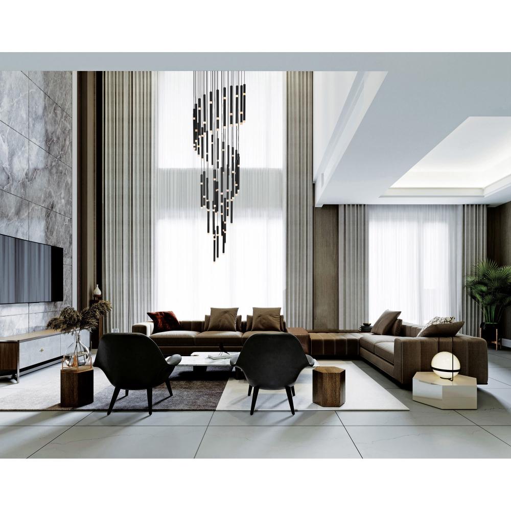 MODERN SPIRAL DESIGN: The Flute 54-Light Chandelier captivates with a cascading spiral of lights suspended from a sleek 30-inch black canopy