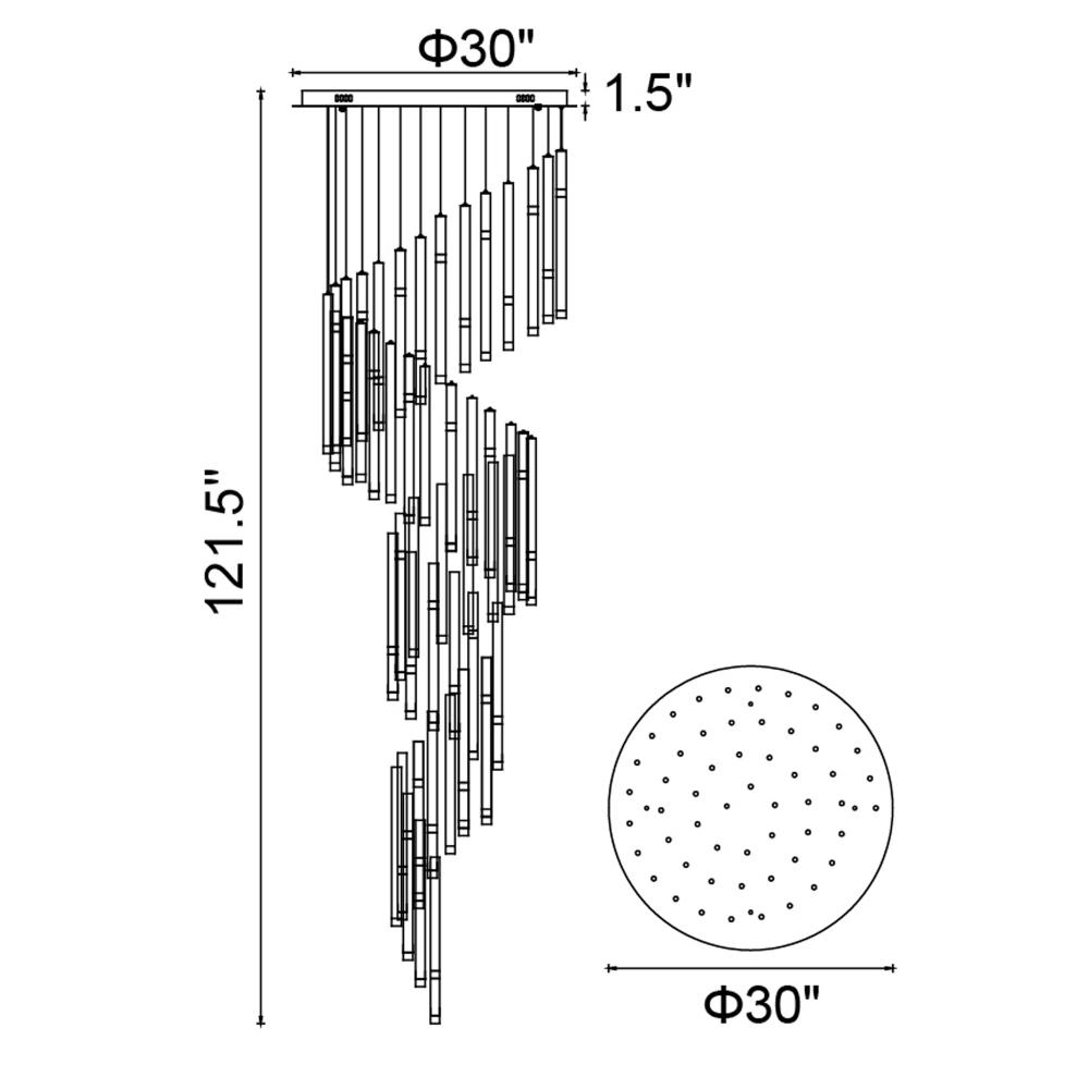Make a grand impression with the Flute 54-Light 30'' Black Spiral Chandelier, a breathtaking modern light fixture designed to elevate your interior with sculptural brilliance. Featuring 54 integrated LED lights gracefully cascading in a spiral formation, this chandelier creates a dynamic, luxurious glow perfect for staircases, hallways, and large open spaces. Its sleek black canopy and minimal lines complement modern decor while adding a dramatic architectural touch to your space. Finish: Black Dimensions: 30 Diameter Canopy Light Source: Integrated LED (54 Lights) Certification: BACL Certified Warranty: 3-Year Manufacturer Warranty