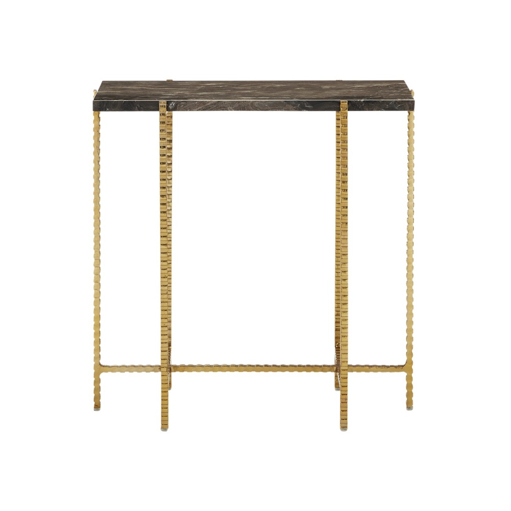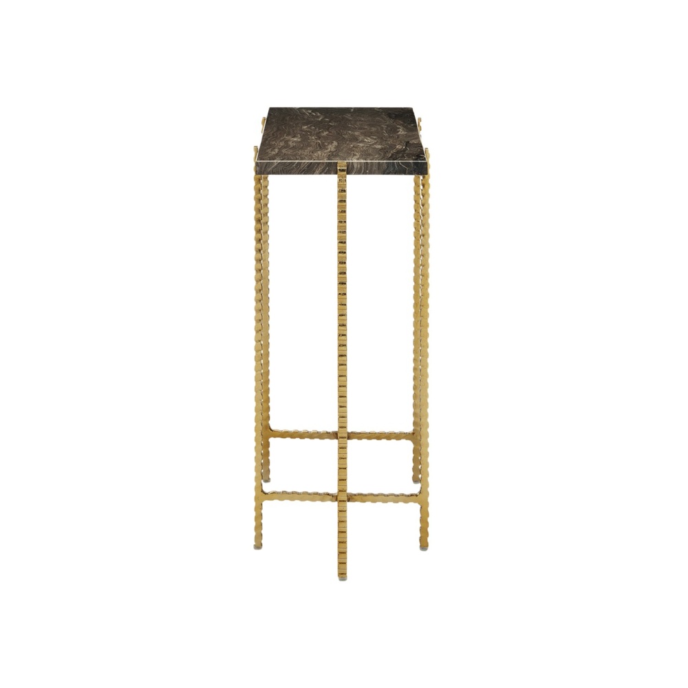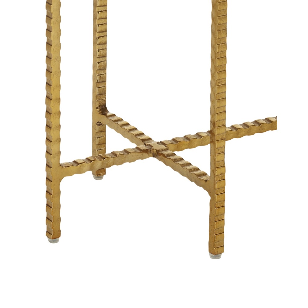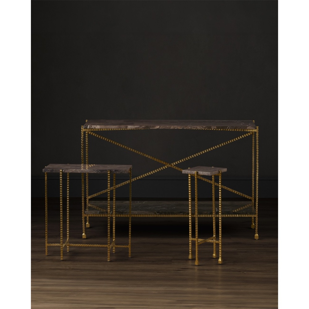 Gold iron and cappuccino-colored stone come together to create the Flying Marble Gold Side Table. The X-shaped stretchers and top support are as toothy as the legs to bring this gold accent table an industrial vibe, but it is also a shoe-in for a contemporary aesthetic. Design details of note are the way the feet swell and the clever way the legs culminate to embrace the brown marble top.