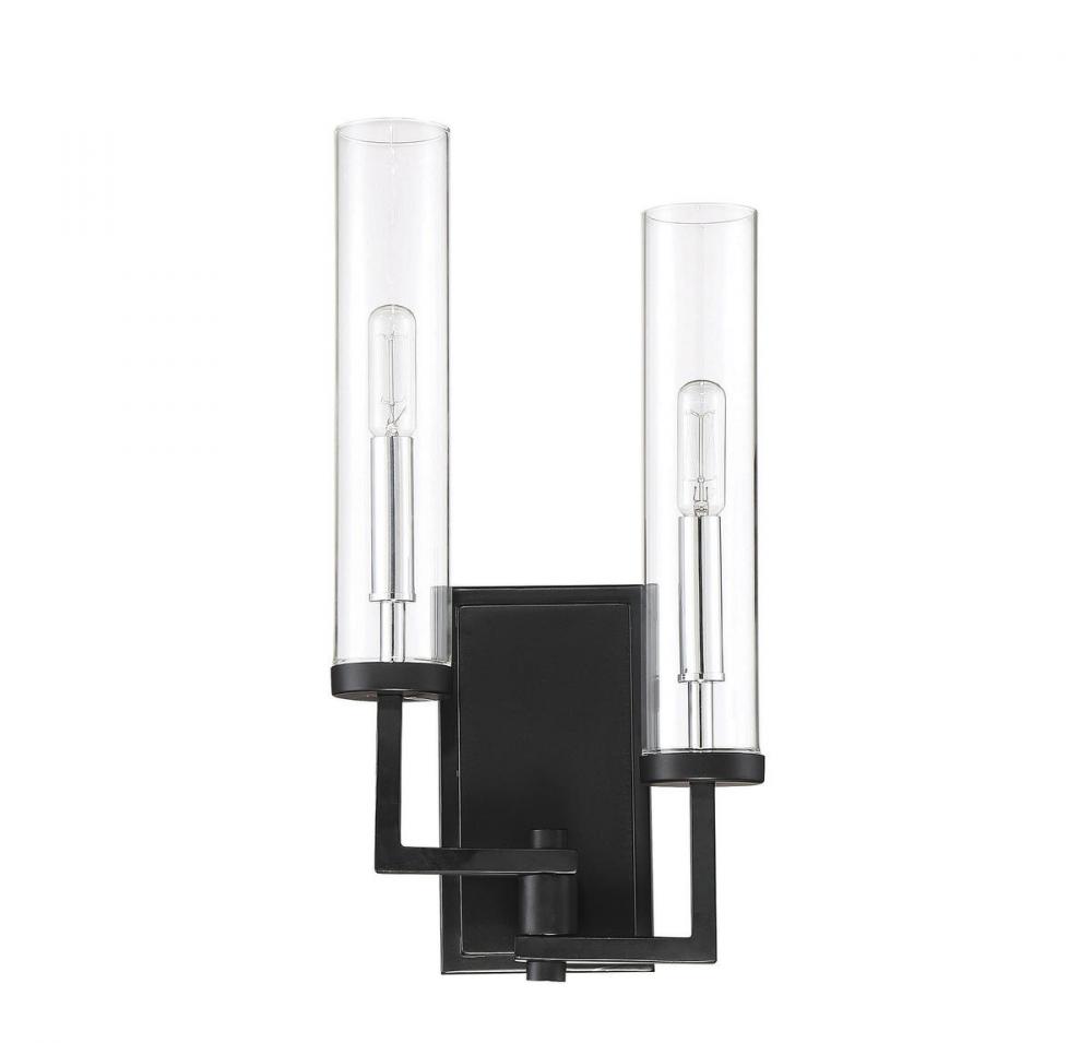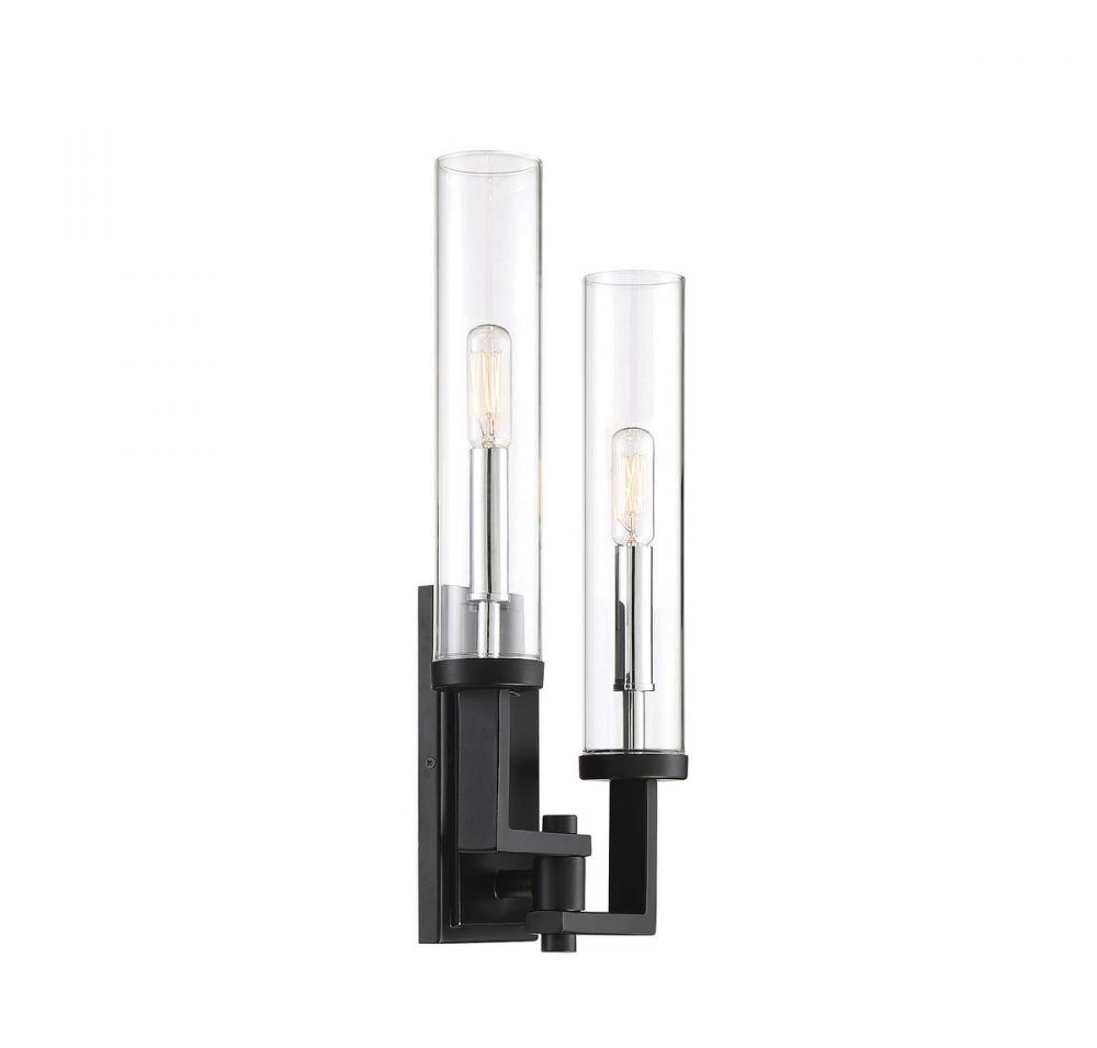 Talk about versatility! The matte black finish and chrome accents of the Savoy House 2-light wall sconce go with everything and the clean, timeless design looks terrific with many decor styles. The slim, tubular clear glass shades around two 60W candelabra size bulbs pair nicely with the branching arms. The overall effect is symmetrically satisfying and adds stylish illumination to your room’s layered lighting.