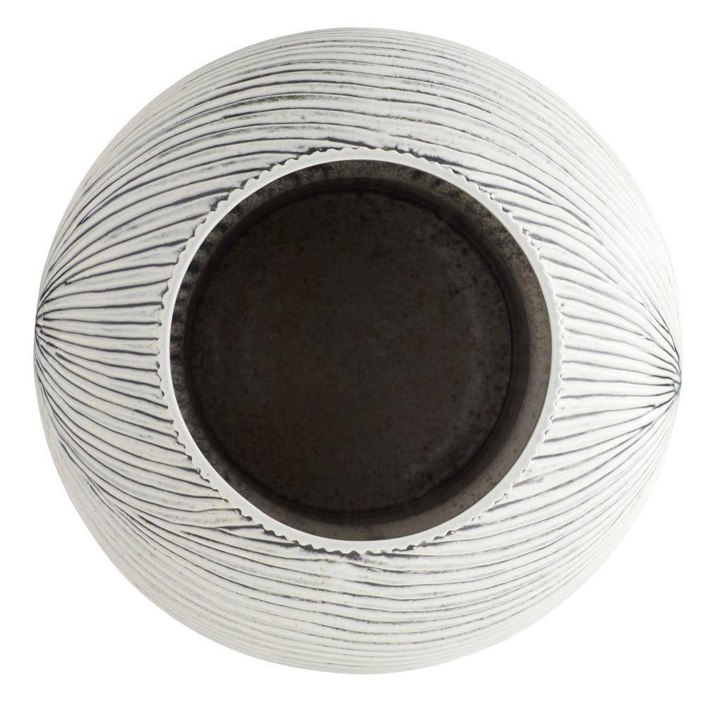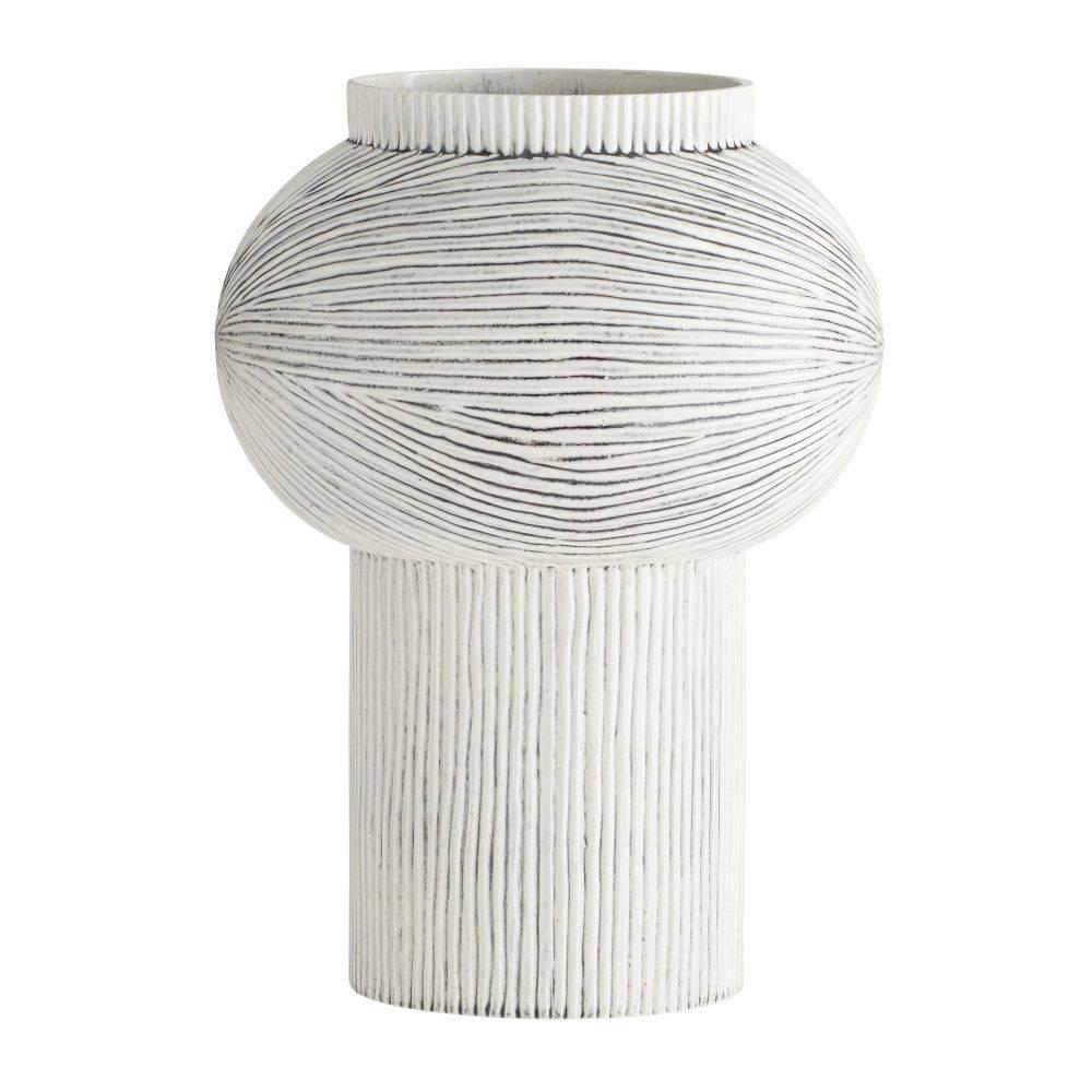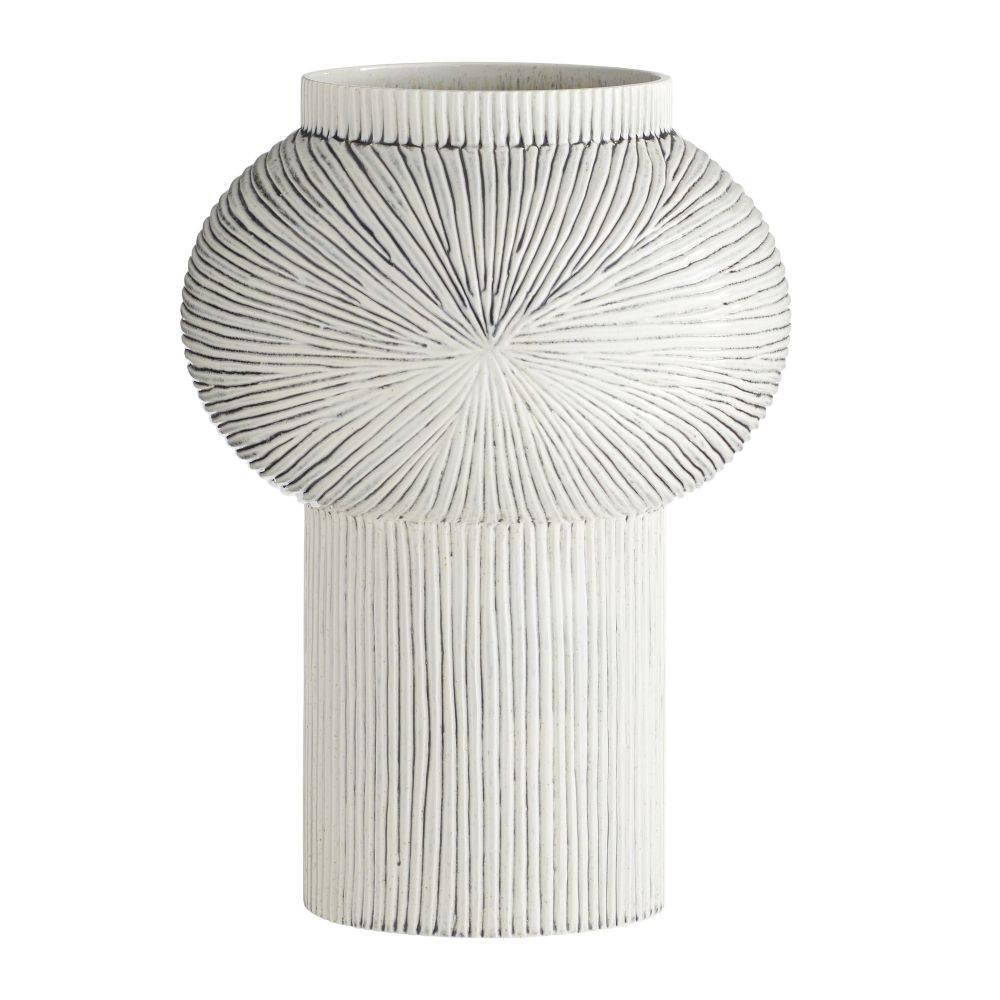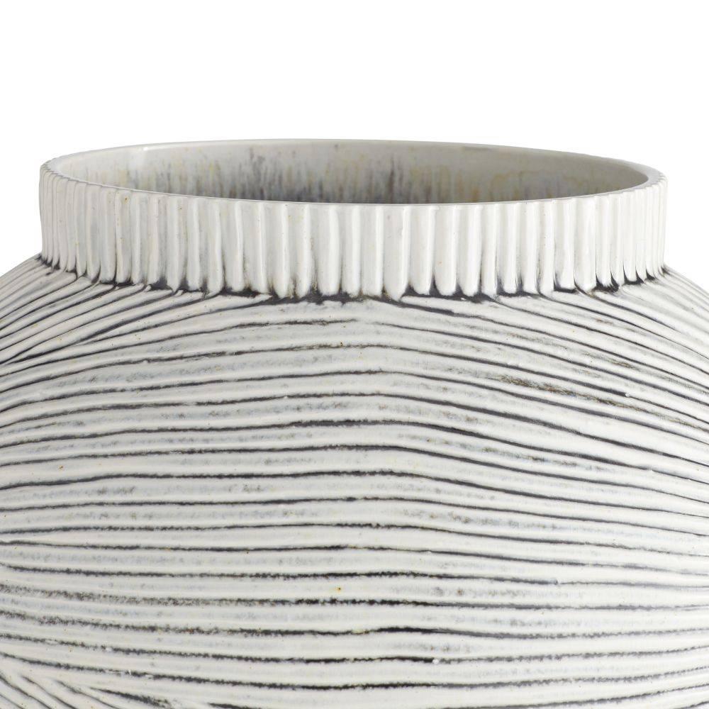 Intricate lines and wave-like textures wrap around this porcelain vase, finished with an ice-reactive glaze. Embracing the lines of platonic geometry, it features a rounded top. Finish will vary.