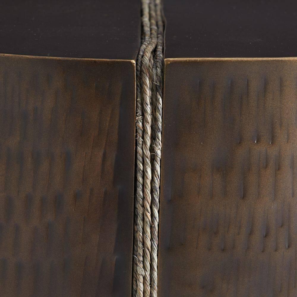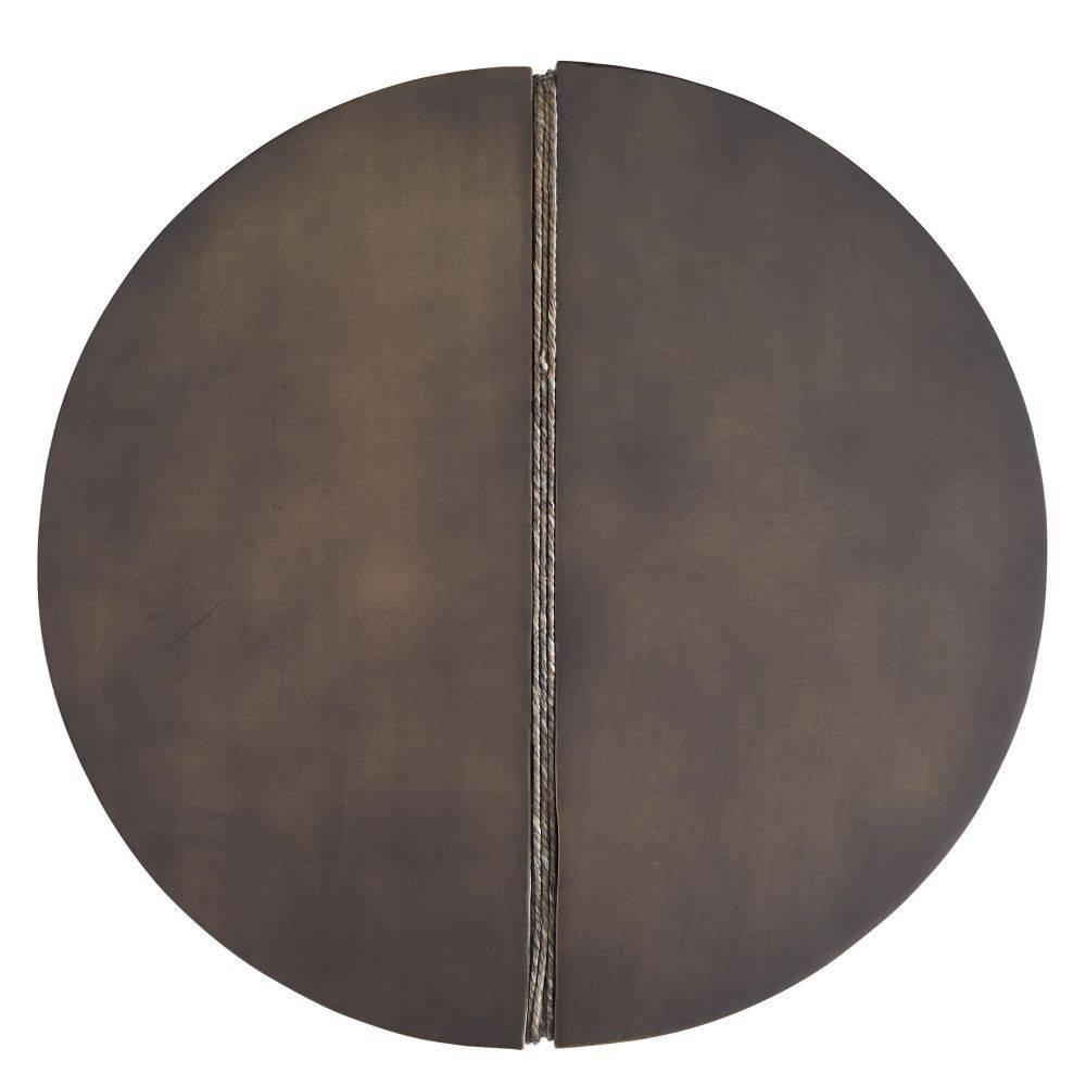 The shape of a calming and meditative singing bowl influenced our table of antique bronze finished iron. This Zen accent piece is bisected with an inset seam of gray rope for a ying-yang effect. A hammered texture, reminiscent of a traditional metal artifact, adorns the sides. Finish will vary.
