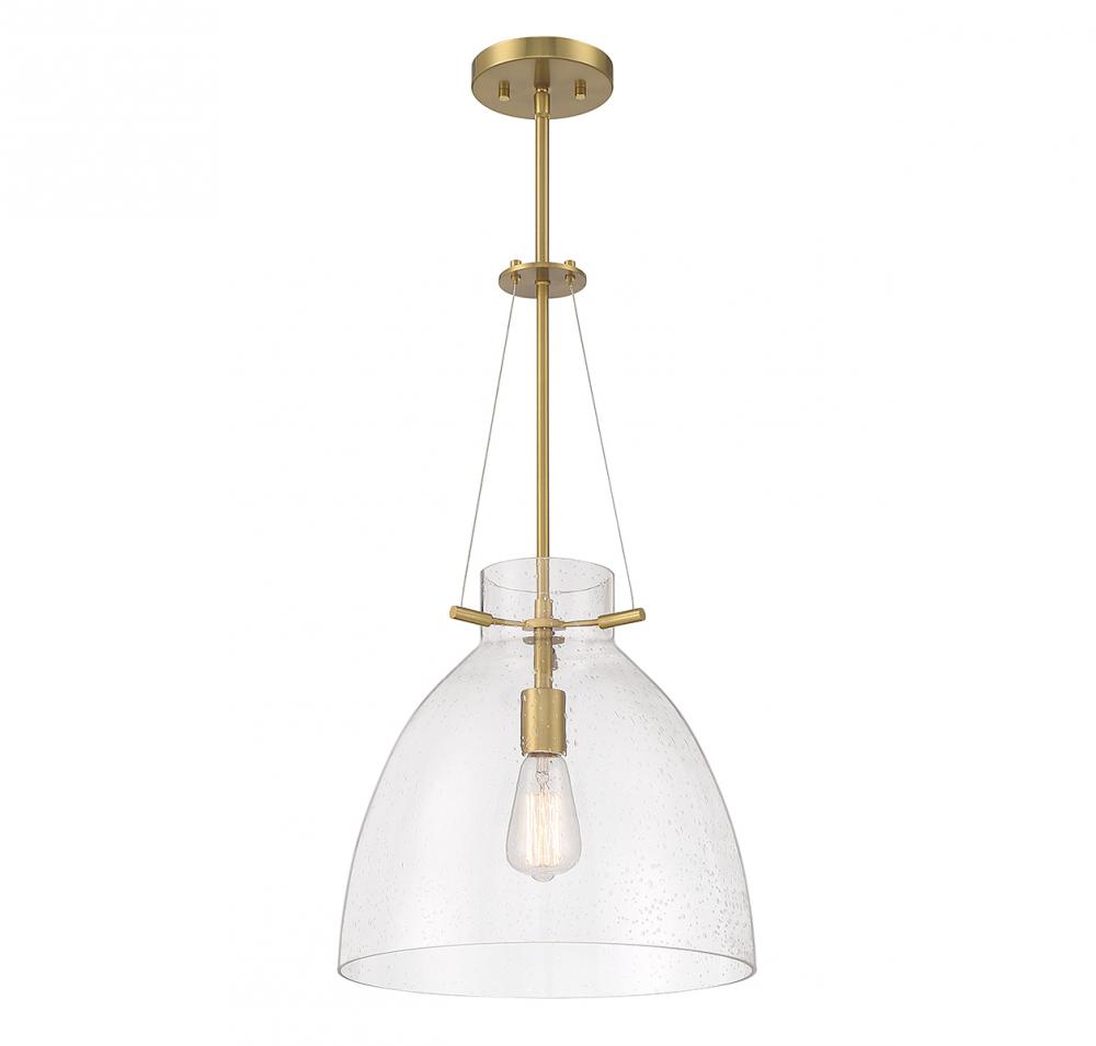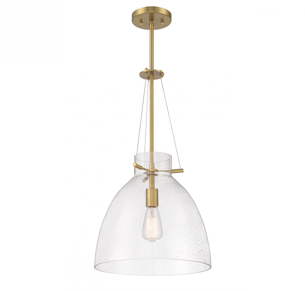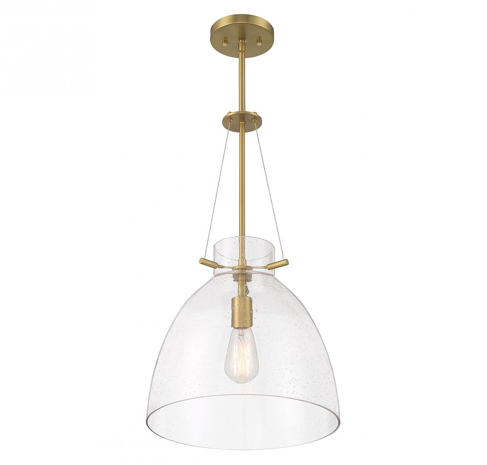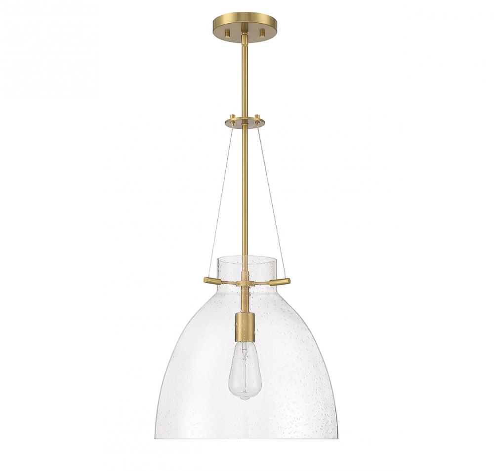 The Savoy House Foster 1-light pendant is the perfect way to add a sleek look to any space. Its large shade of clear seeded glass has a pleasantly curving shape and pairs nicely with the warm brass finish. Foster is 25.5" in height and 14" in width. It uses 1 standard size bulb with a max of 60 watts (bulb not included). Comes with four 12" downrods and one 6" downrod.