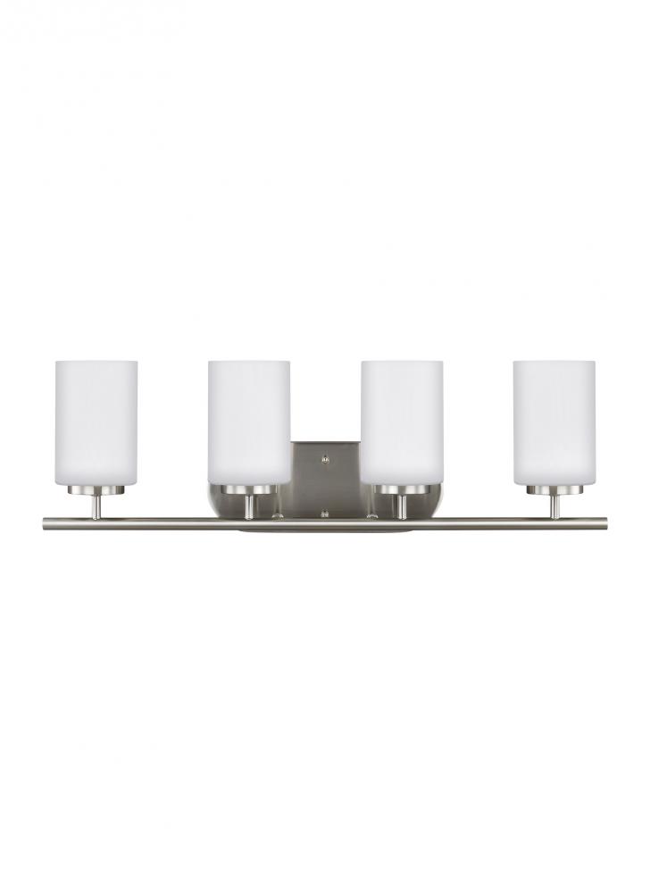 The Oslo four light vanity fixture in brushed nickel offers shadow-free lighting in your powder room, spa, or master bath room. The Oslo lighting collection by is a sleek design, with smooth and clean lines. The Opal Etched glass adds to this collection's contemporary and minimalist character. Offered in Chrome, Brushed Nickel, Burnt Sienna and textured Blacksmith finishes, the collection includes nine-, five-, and three-light chandeliers, pendants in four sizes, both flush and semi-flush ceiling fixtures, as well as one-, two-, three- and four-light wall/bath fixtures. Both incandescent lamping and ENERGY STAR-qualified LED lamping are available. All fixtures are California Title 24 compliant.