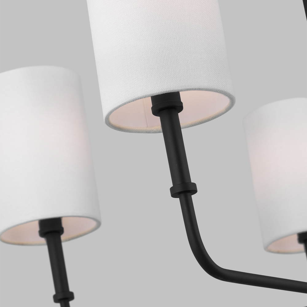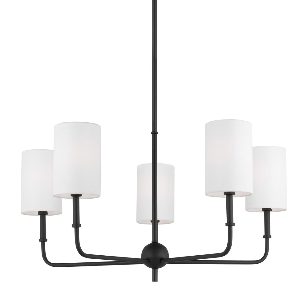 The Foxdale five-light single-tier chandelier in Midnight Black encompasses the new traditional style with flawless execution. Refined and clean-lined, this classic silhouette is timeless without being stuffy. Perfectly transitional, this collection can be placed in any home regardless of style. Topped with White Linen Shades to complete the design.