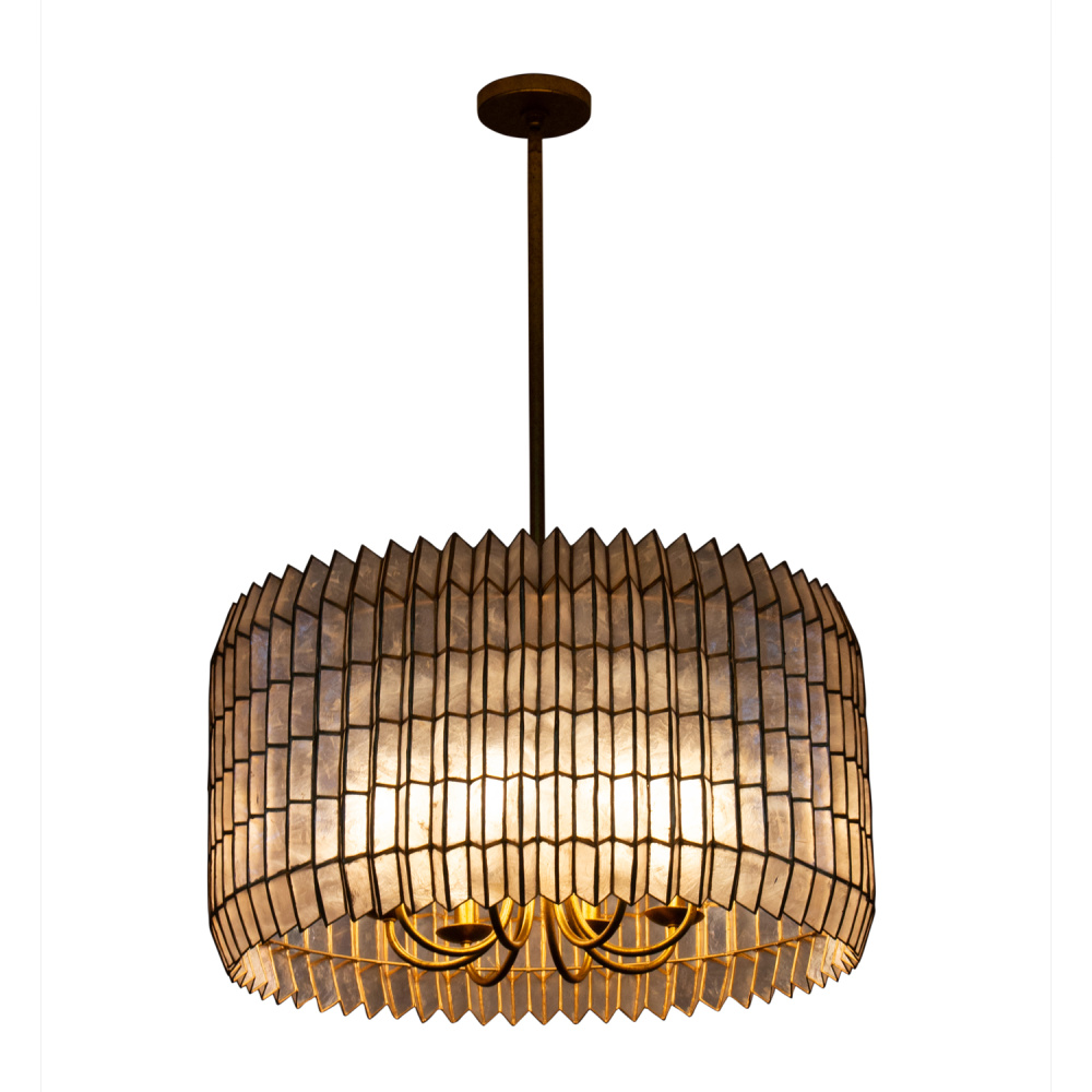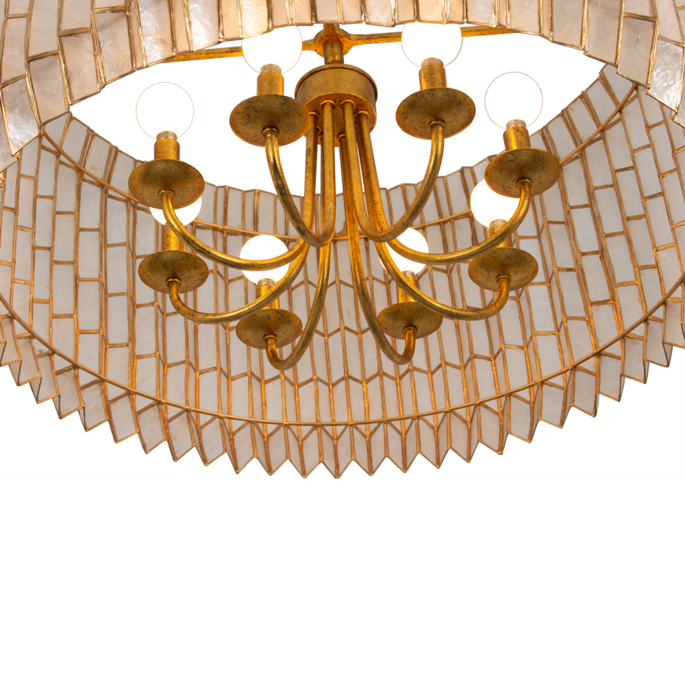 Drawing inspiration from origami, geometric designs, and the natural elegance of crystal cuts, the Fractal collection showcases a captivating zig-zag frame pattern mirrored in the capiz shade’s form. It emanates a gentle, warm glow that beautifully highlights its intricate design and understated shape. The piece is completed with a hand-applied Oxidized Gold Leaf (OL) finish, adding a touch of refined artistry.