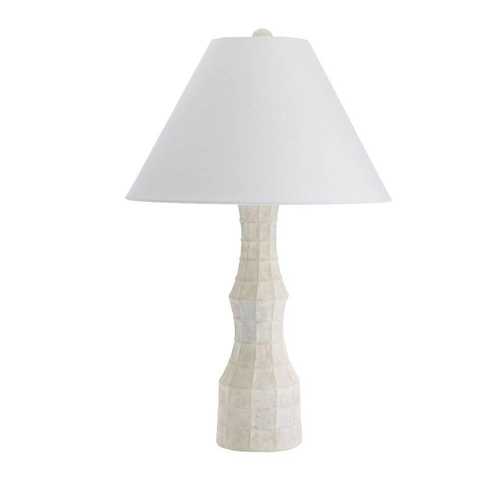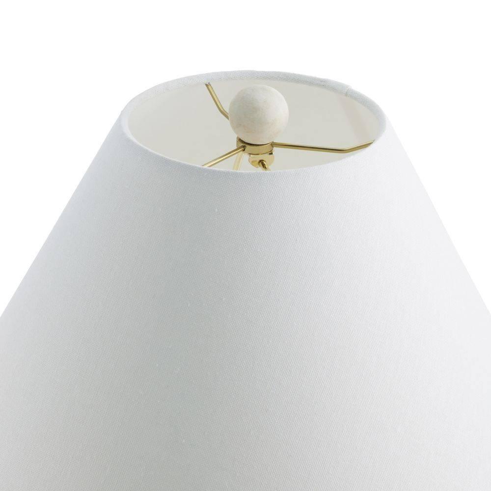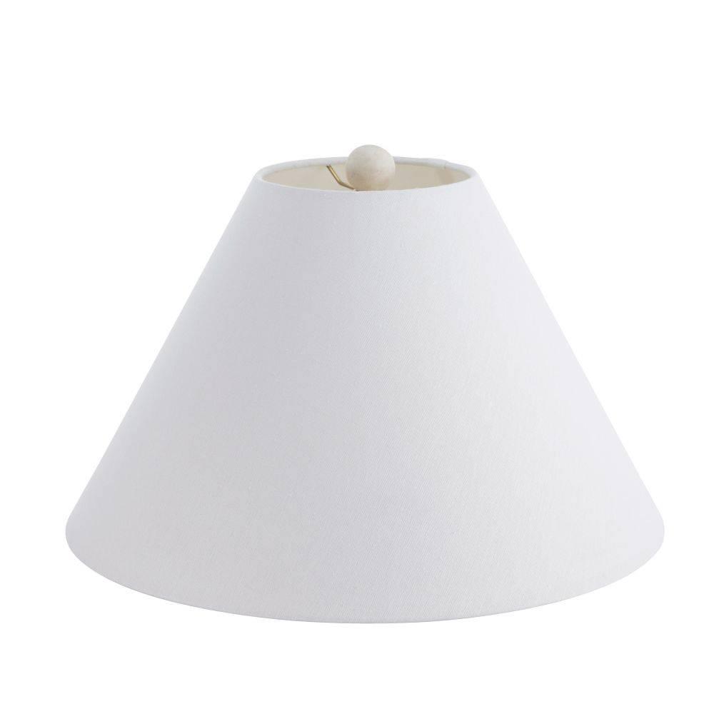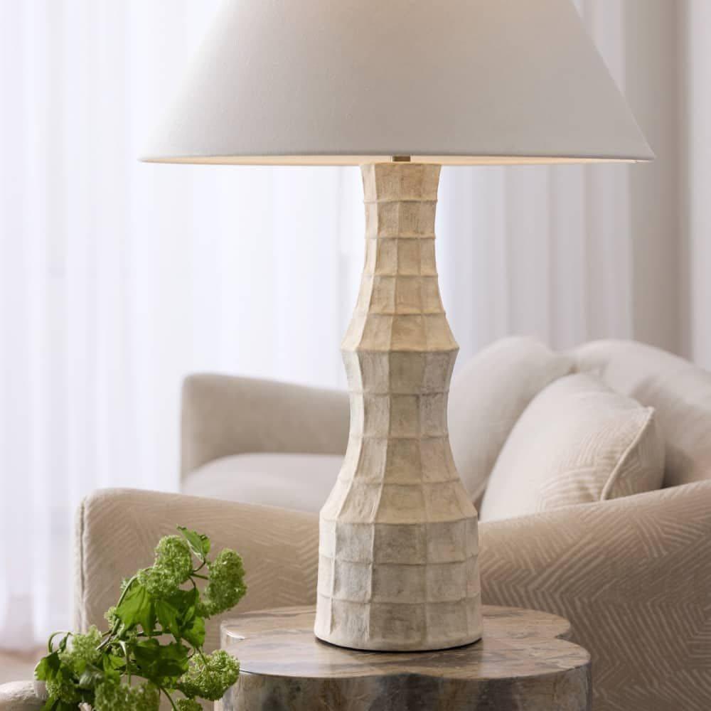 The textural embossing on our terracotta Francine may recall a bat's wing or spider's web. Evoking an ancient structure, this inspired accessory is glazed in sheer eggshell and finished with antique brass-plated steel hardware. The off-white linen drum shade is lined in white cotton and matches the ivory finial. Finish will vary.