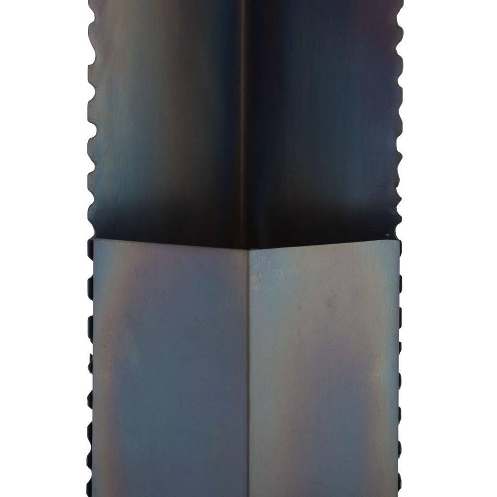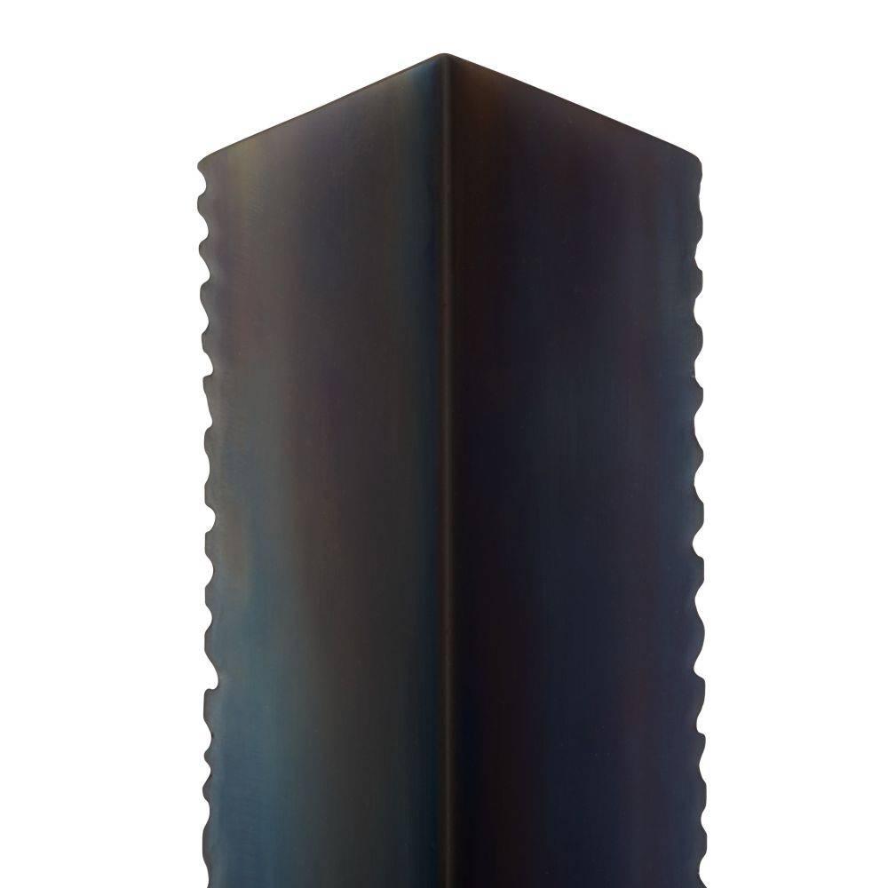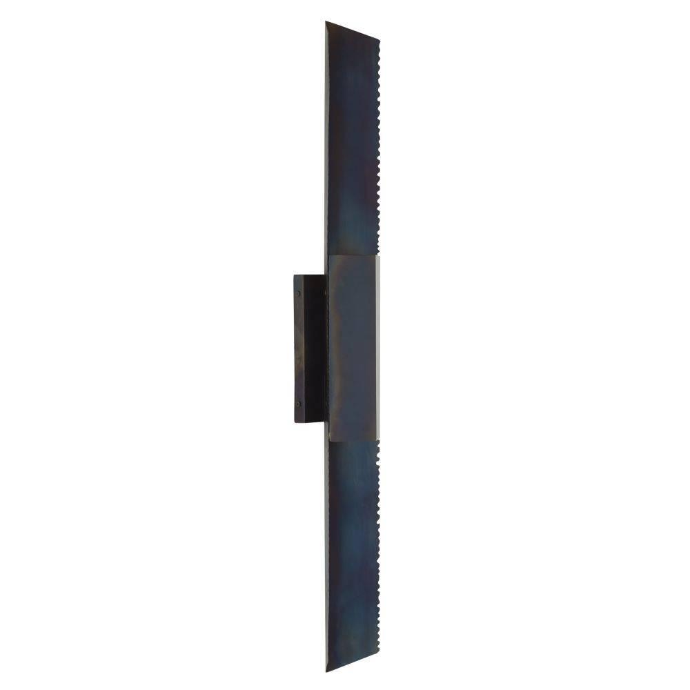 Contemporary mirrored architecture gets a literal edge with our burnt iron sconce. Brutalist-inspired sawtooth details are juxtaposed with a V-shaped grooved opening that allows light to highlight its blue-hued finish. Can be staged horizontally and vertically. Damp-rated, although limited covered outdoor areas may affect finish. Finish will vary.