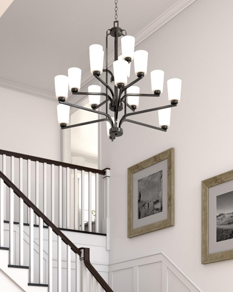 The Franport fifteen light multi-tier chandelier in bronze enhances the beauty of your home with ample light and style to match today's trends. Modernist influences abound in the Franport Collection. Shades with sharp lines and simplified bases showcase the minimalist approach with a twist. Franport has fixtures for all parts of the property. Available in both Burnt Sienna and Brushed Nickel finish choices as well as Nickel for bath fixtures. with fixtures in various sizes and configurations, the Franport Collection will coordinate the same design theme across several different rooms. Its assortment includes three-, five-, nine- and fifteen-light chandeliers; and one- two-, three- and four- light bath vanity fixtures. The Franport collection pars wonderfully with Geary ceiling fixtures. Incandescent and ENERGY STAR-qualified LED lamping are available; all fixtures are California Title 24 compliant.