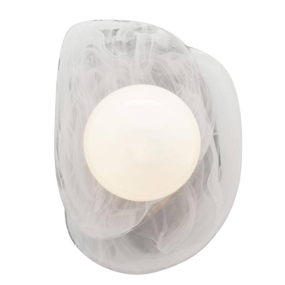 Mimicking a pearl inside an oyster's shell, an opal glass orb is mounted to a handblown swirl glass fixture and secured to a brass-plated iron backplate, this jewel-like light can be hung in any direction. Damp-rated, although limited covered outdoor areas may affect finish.